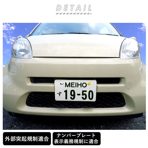 注意点軽自動車の場合、リアのナンバーボルトにも取り付けることが出来ます。普通乗用車の場合、リアのナンバーには封印があるため、右側のボルトにしか取り付けられません。使用する際に、きちんと装着されているか、本品が破損していないか確認してください。湿度、油分、汚れ等により両面テープが剥がれる場合がありますので注意してください。洗車の際、高圧な水等を故意にあてたり、強い力でこすらないでください。本品にはワックス・光沢剤・アルカリ性洗剤等を付着させないでください。くすみ・変色の恐れがあります。取り付け部分が変色したり、日焼けによる取り付け跡が残る場合がありますので、注意してください。本品は、日光や紫外線により、色落ち・変色する場合がありますので注意してください。小さなお子様の手の届かない場所に保管してください。小さな部品が含まれておりますので、小さなお子様が誤って口に入れないよう十分注意してください。本品の使用が困難な場合は、無理に取り付けないでください。誤った取り付け及び改造して使用した際の、事故、故障、破損等につきましては、当社では一切その責任、保証は負いかねます。カメラやモニターの性質により、画像と実物の色の違いがある場合がございますのでご理解願います。