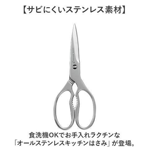 | 商品説明 | 【サビにくいステンレス素材】食洗機OKでお手入れラクチンな「オールステンレスキッチンはさみ」が登場。【毎日大活躍するキッチンはさみ】食洗機で洗えて、サビに強い。毎日使いにぴったりな、1つは欲しいキッチンツール。【分解して洗えて、清潔に◎】大きく広げると2つに分解できる!隙間まで丸洗いできるから、清潔な状態をキープできる!【滑らずにしっかりカット】ギザ刃が食材や滑りやすいビニールをしっかりと捉え、ラクにカットできる。切れ味が自慢。【はさみ、殻割りどちらも対応】はさみとしてはもちろん、持ち手ぼ部分で殻割もできる2WAY仕様。【シンプルでおしゃれ☆】キッチンに置いていてもおしゃれに見せる、ワンカラー。キッチン雑貨にこだわりたい方へ♪ |