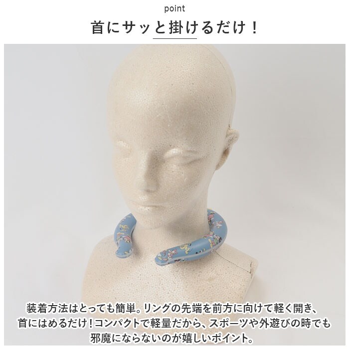 | 商品説明 | 真夏のお出掛けも、大好きなキャラクターと一緒ならひんやり快適。「涼感リング(Mサイズ)」が新登場。【首元冷やして、クールダウン】身体全体を冷やすには、首すじの血液を冷やすことが効果的♪絵柄の可愛い涼感リングを首にフィットさせるだけで、ひんやりクールダウン。(※中身が固まった状態からの使用で、約90分~120分程度約29度の冷たさが持続)【28度以下で自然に凍結!】リングの内部には、繰り返し熱と冷気を放出する特殊冷却物質「ノルマルパラフィン(オクタデカン)」を充填。28度以下で自然凍結し、心地よい温度をキープ。【首にサッと掛けるだけ!】装着方法はとっても簡単。リングの先端を前方に向けて軽く開き、首にはめるだけ!コンパクトで軽量だから、スポーツや外遊びの時でもジャマにならないのが嬉しいポイント。【やさしく、ひんやり】冷たい水につけるだけで手軽にひんやりとした温度に変化。早く凍らせたい時には、冷蔵庫や冷凍庫に入れて冷やせば、冷却時間の短縮が可能。【繰り返し使えてエコ♪】保冷剤のように時間をかけて冷却する手間がなく、充電作業や電池も一切不要!繰り返し使えるからとってもエコ♪【適度な冷却温度が持続】着けるだけで、適度な冷却温度が持続。素肌に触れても冷え過ぎないマイルドな冷たさだから、お子さまのデリケートな肌にも安心。【快適なままひんやり】保冷剤や氷と違い、溶ける際に結露もしづらいため、肌や衣服が濡れることなくサラサラの付け心地が長続き。【子どもも大人も使える♪】女性やお子さまにちょうどいい、首回り約33cmのMサイズ。(※首回りのめやす:女性約31.2cm。個人差がある場合がありますので、予めご了承ください。)【真夏の猛暑対策に!】アウトドアやスポーツ、真夏のお出掛け時の熱中症対策に大活躍!可愛いキャラクターの涼感リングで、いつでも手軽にクーリングタイム。 |