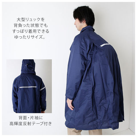 | 商品説明 | 大型リュックを背負った状態でもすっぽり着用できるゆったりサイズ。リュックレインコート。レインコートのフロント部分はボタン+ジップファスナーのダブル構造。さらに袖口も二重構造なので、雨の侵入をしっかりと防ぐ!雨や風は通さずに、発汗によるムレを逃がす透湿防水素材を採用。(耐水圧10,000mm透湿性5,000g/m224hr)さらに、レインコート正面胸部分にはベンチレーションを設けてコート内の湿気を排出することで通気性を向上。コート内側は総裏メッシュ加工でサラサラとした肌触り。湿気の多い季節でも快適。背面のボタンでマチを調節可能。リュックを背負わない時はすっきりとしたシルエットで着用できる。背面片袖に高輝度反射テープ素材付きで、早朝や夜間でもすれ違う車からの視認性が高くなり、安全性を確保。ヘルメットの上から着用が可能なワイドビューフード付き。クリア素材部分が広めに取られていて、前が見やすく安全。取り外しも可能。持ち運びに便利な携帯袋が付属。携帯袋とジャケットコートの裾裏にネームタグ付き。 |