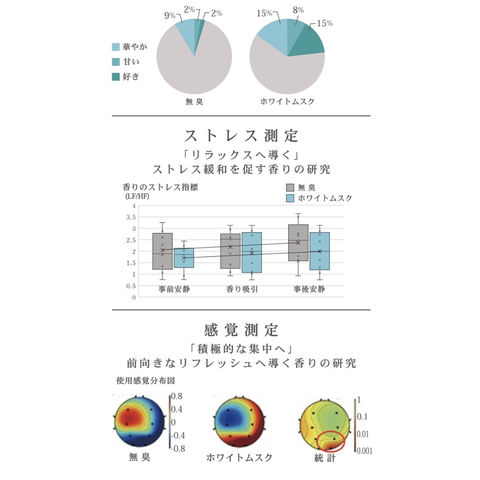 | 商品説明 | 九州大学との共同研究により証明された、心地よい香りでリラックスできる効果。科学的に考案されたユニセックスなホワイトムスクの香りが、リラックスした気分へと導きます。植物性消臭成分を配合し、スプレーをすると心地よい香りが空間に広がり、気になる臭いを和らげます。ファブリック&ルームミストとして、清潔感のある空間をサポートします。 |