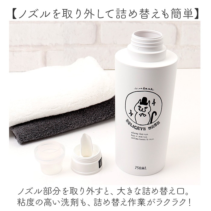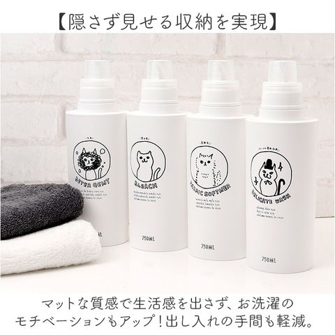 | 商品説明 | 【ネコちゃんと楽しいお洗濯タイム♪】ランドリーまわりがおしゃれ空間に。日本製「neco laundry ディスペンサー L」【ほっこり癒やしのデザインが魅力】シンプルなモノトーンカラー&手書き風の愛らしいネコちゃんイラスト☆ふんわりとした印象に。【隠さず見せる収納を実現】マットな質感で生活感を出さず、お洗濯のモチベーションもアップ!出し入れの手間も軽減。【使い勝手もしっかり考えたノズル】ノズルは液ダレしにくいようにデザイン。透明キャップに注ぎやすく、ノンストレス◎【ノズルを取り外して詰め替えも簡単】ノズル部分を取り外すと、大きな詰め替え口。粘度の高い洗剤も、詰め替え作業がラクラク!【たっぷり入る容量750mlサイズ】スタイリッシュな見た目ながら、容量はしっかりと。継ぎ足しの頻度も抑えて快適。【計量メモリ付きでとっても便利】キャップには5mlから20mlまでのメモリ付き。詰め替えても不便なく使えるのが嬉しい♪【個性の光る4種類のボトル】それぞれのイメージに合わせたイラスト入り。全部揃えて置くだけで、可愛らしいインテリアに。 |