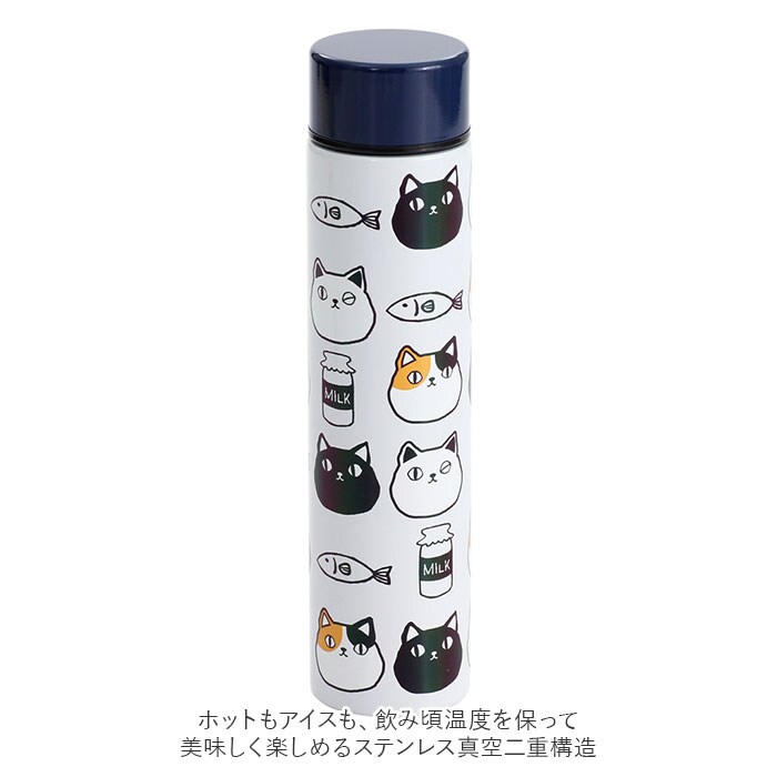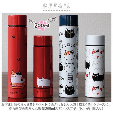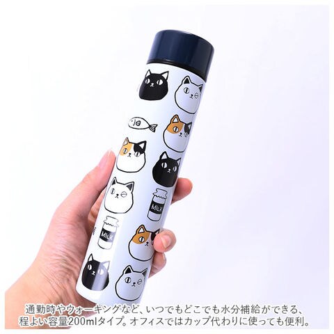 | 商品説明 | お澄まし顔のまんまるシルエットに癒される♪大人気「猫3兄弟」シリーズに、軽量200mlステンレスプチボトルが仲間入り!小さめバッグの片隅にちょこんとスリムに収納できて、持ち運びの楽ちんな200mlプチサイズ。ホットもアイスも、飲み頃温度を保って美味しく楽しめるステンレス真空二重構造なので、夏から冬まで一年中大活躍!キャップ内側に付いたゴムパッキンで、持ち運び中の液漏れもしっかり防止。飲み口部分は安全性に配慮し、フチを丸く厚めに加工。口当たりが優しく、洗浄時にも安心なつくり。通勤時やウォーキングなど、いつでもどこでも水分補給ができる、程よい容量200mlタイプ。オフィスではカップ代わりに使っても便利。ずんぐりむっくり猫さんたちの憎めない表情にほっこり癒される♪毎日のコーヒーブレイクにオススメ。 |