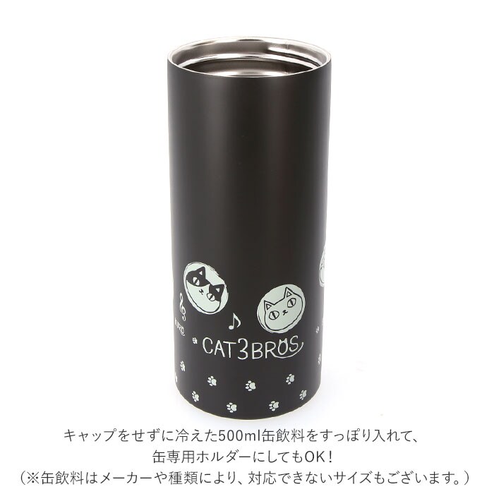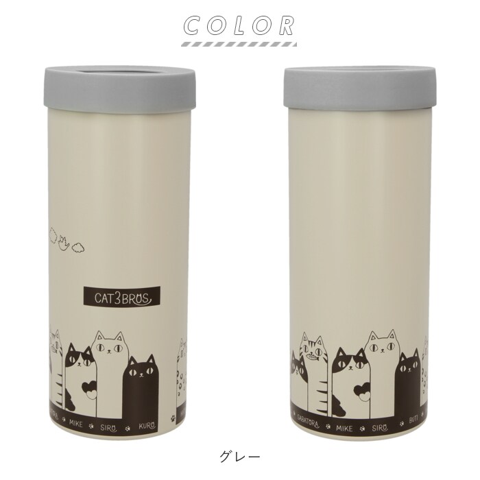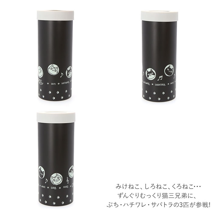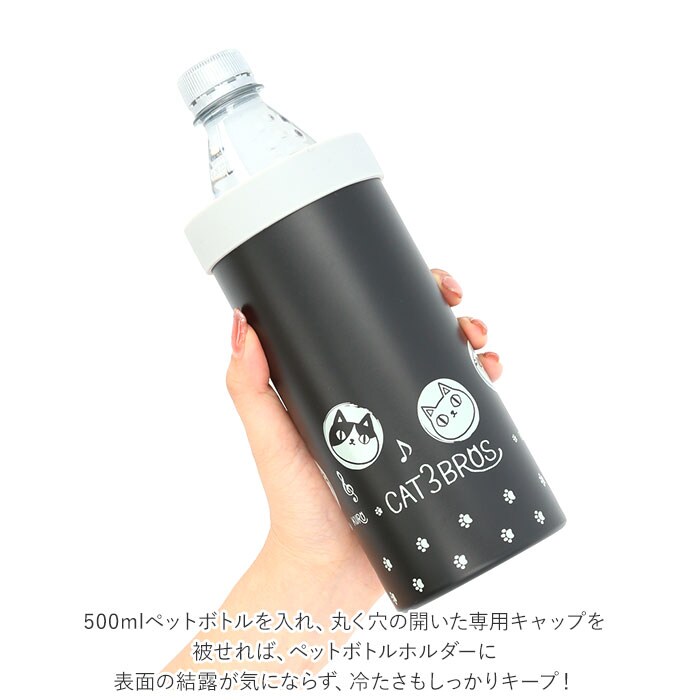 商品説明お澄まし顔のまんまるシルエットに癒される♪大人気「猫三兄弟」シリーズの3WAYステンレスボトル。ペットボトルホルダー、缶飲料ホルダー、そのままドリンクを入れてステンレスボトル!シンプルだけど、いろいろ使える3WAY仕様。冷たいドリンクも温かいコーヒーも、飲み頃温度を保って美味しく楽しめるステンレス真空二重構造。500mlペットボトルを入れ、丸く穴の開いた専用キャップを被せれば、ペットボトルホルダーに。表面の結露が気にならず、冷たさもしっかりキープ!直接飲み物を注いで、キャップをキュッと閉めれば、ドリンクがたっぷり入るステンレスボトル。通常の水筒に比べて広口なので、氷が入れやすいのがポイント!キャップをせずに冷えた500ml缶飲料をすっぽり入れて、缶専用ホルダーにしてもOK!(※缶飲料はメーカーや種類により、対応できないサイズもございます。)ご自宅でキンキンに冷えたビールを楽しみたいときはもちろん、オフィスでのコーヒーブレイクでも大活躍。みけねこ、しろねこ、くろねこ・・・ずんぐりむっくり猫三兄弟に、ぶち・ハチワレ・サバトラの3匹が参戦!手に取るたびに笑顔がこぼれる可愛いらしいデザイン◎