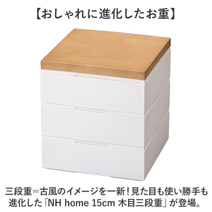 | 商品説明 | 【おしゃれに進化したお重】三段重=古風のイメージを一新!見た目も使い勝手も進化した「NH home 15cm 木目三段重」が登場。【木目調のモダンデザイン】天然木のような風合いが美しい上蓋。和にも洋にも映える落ち着いたデザインが魅力。【軽くて扱いやすい樹脂製】陶器のような上質感をもちながら、持ち運びしやすい軽量樹脂素材で気軽に使える設計。【汁もれしにくい構造】各段にシール蓋付き。持ち運び時にも汁もれの心配が少なく、バッグの中も安心。(※)密閉ではありません。【日本製のしっかり品質】細部まで丁寧に作られた日本製。普段使いにもおもてなしにも安心して使える仕立て。【2~3人にちょうどいいサイズ感】1辺約15cmのミニマムサイズ。少人数の集まりやお弁当感覚で使える気軽さもポイント。【お祝いにもアウトドアにも】おせちや行楽弁当、ピクニックなど季節のイベントに映える万能アイテム。 |