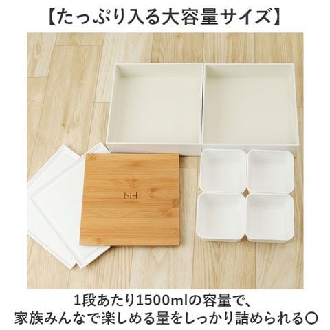 | 商品説明 | 【和の趣を演出】蓋ありでおせちも運動会も安心の二段重。【各段にシール蓋ありで安心】各段に蓋が付いているから持ち運びも安心◎【くぼみ付きで開けやすい】シール蓋にくぼみがあるから指をかけてサッと開けられる♪【たっぷり入る大容量サイズ】1段あたり1500mlの容量で、家族みんなで楽しめる量をしっかり詰められる〇【竹蓋が和の風情を添える】1段目には竹製の蓋が付いていて、食卓に上品な和の趣を演出。【中子4個で盛り付け自在】中子が4個付属しているから料理を美しく仕切れて、見栄えよく盛り付け! |