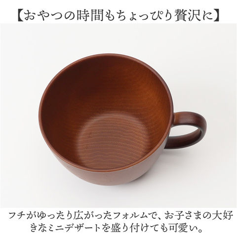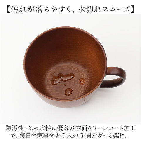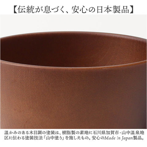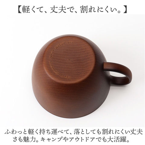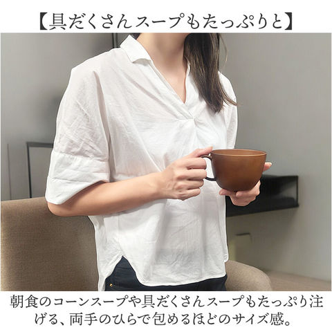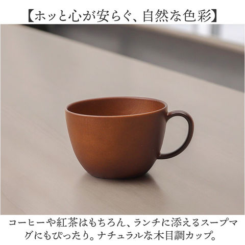 | 商品説明 | 【手軽におうちでカフェ気分♪】温かみのある木目の風合いで、食卓が明るく華やぐ「NH home 木目カップ」が新登場!【ホッと心が安らぐ、自然な色彩】コーヒーや紅茶はもちろん、ランチに添えるスープマグにもぴったり。ナチュラルな木目調カップ。【具だくさんスープもたっぷりと】朝食のコーンスープや具だくさんスープもたっぷり注げる、両手のひらで包めるほどのサイズ感。【おやつの時間もちょっぴり贅沢に】フチがゆったり広がったフォルムで、お子さまの大好きなミニデザートを盛り付けても可愛い。【汚れが落ちやすく、水切れスムーズ】防汚性・はっ水性に優れた内面クリーンコート加工で、毎日の家事やお手入れ手間がグっと楽に。【電子レンジ・食洗器の使用OK!】カップの素地は耐熱温度140度のPET・ABS樹脂素材。電子レンジでの温め直しや食洗機にも対応!【軽くて、丈夫で、割れにくい。】ふわっと軽く持ち運べて、落としても割れにくい丈夫さも魅力。キャンプやアウトドアでも大活躍。【伝統が息づく、安心の日本製品】温かみのある木目調の塗装は、樹脂製の素地に石川県加賀市・山中温泉地区に伝わる塗装技法「山中塗り」を施したもの。安心のMade in Japan製品。【About NH home シリーズ】・「NH home」は、ナチュラルなカフェテイストのルックスに、手軽に使える便利な機能性をプラス!毎日の食卓を素敵に彩るテーブルウェアシリーズ。 |