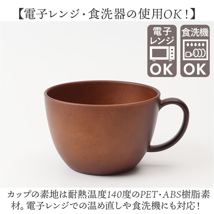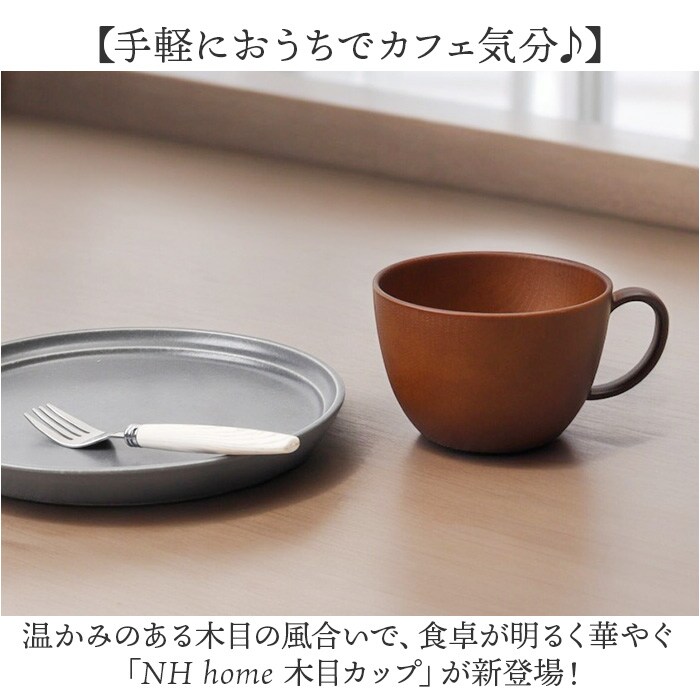 | 商品説明 | 【手軽におうちでカフェ気分♪】温かみのある木目の風合いで、食卓が明るく華やぐ「NH home 木目カップ」が新登場!【ホッと心が安らぐ、自然な色彩】コーヒーや紅茶はもちろん、ランチに添えるスープマグにもぴったり。ナチュラルな木目調カップ。【具だくさんスープもたっぷりと】朝食のコーンスープや具だくさんスープもたっぷり注げる、両手のひらで包めるほどのサイズ感。【おやつの時間もちょっぴり贅沢に】フチがゆったり広がったフォルムで、お子さまの大好きなミニデザートを盛り付けても可愛い。【汚れが落ちやすく、水切れスムーズ】防汚性・はっ水性に優れた内面クリーンコート加工で、毎日の家事やお手入れ手間がグっと楽に。【電子レンジ・食洗器の使用OK!】カップの素地は耐熱温度140度のPET・ABS樹脂素材。電子レンジでの温め直しや食洗機にも対応!【軽くて、丈夫で、割れにくい。】ふわっと軽く持ち運べて、落としても割れにくい丈夫さも魅力。キャンプやアウトドアでも大活躍。【伝統が息づく、安心の日本製品】温かみのある木目調の塗装は、樹脂製の素地に石川県加賀市・山中温泉地区に伝わる塗装技法「山中塗り」を施したもの。安心のMade in Japan製品。【About NH home シリーズ】・「NH home」は、ナチュラルなカフェテイストのルックスに、手軽に使える便利な機能性をプラス!毎日の食卓を素敵に彩るテーブルウェアシリーズ。 |