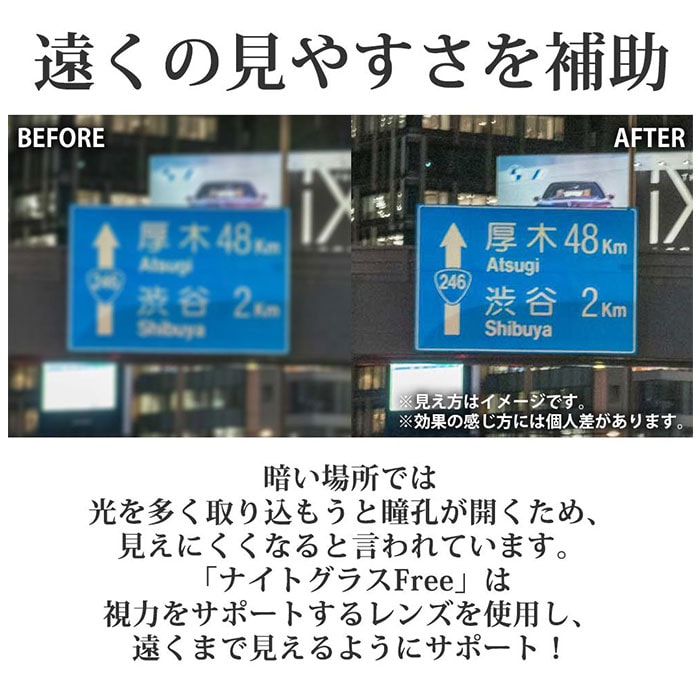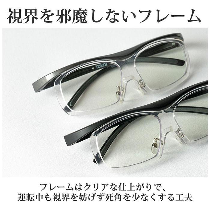 | 商品説明 | メガネの上からでも単体でも使える◎夜間の視界をクリアにする「ナイトグラス Free」が登場。【夜間の目のお悩みに】夜の運転時に視界がぼやけやる、対向車のライトがまぶしいなど、夜間に起こる目のお悩みを解決してくれるアイテム。【安心の品質】昭和14年に創業した、歴史のある東海光学株式会社が作った、夜間専用レンズを使用。メガネレンズ専用メーカーだからできた、渾身の製品。【視力をアシスト】視界がぼやけやすくなってしまいがちな、夕暮れや夜間。日中よりも低下してしまう視力を補正しアシストしてくれる機能でクリアな視界を実現!※特許取得済【眩しさを抑えて、明るさを確保】対向車のライトなどのまぶしい光を抑えつつ、明るさをしっかりと確保。暗闇で最も明るさを感じる、510nm付近の光を十分に透過させるレンズを開発し、視界を暗くせずに眩しさを抑えることに成功。【使い方Free】メガネの上からでも、単体でも使えるFreeタイプ。クリップ装着が面倒、メガネ有り無しどちらでも使いたい方にオススメ☆【フィット感】あらゆる鼻の位置にフィットするよう設計されたU字型の鼻パッド!ずり落ちにくく、しっかり固定。【専用ケースつき】専用の収納ケースつき。レンズを傷つけずに保管できるのも嬉しいポイント。【使用シーンいろいろ】夕暮れや夜の運転時はもちろん、ナイトラン・ジョギングなどの夜間トレーニングでも活躍。クリアなので、昼の運転や運動時にも◎ |