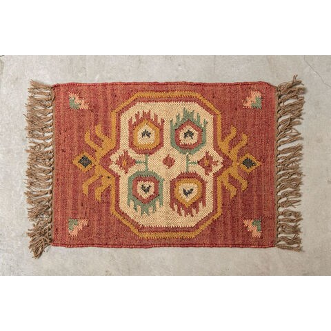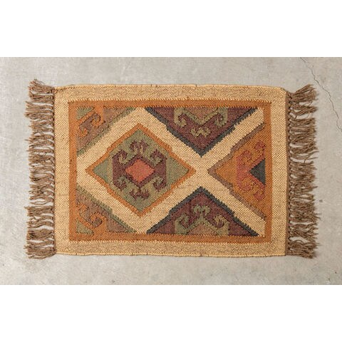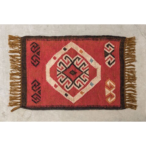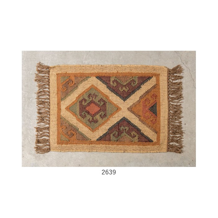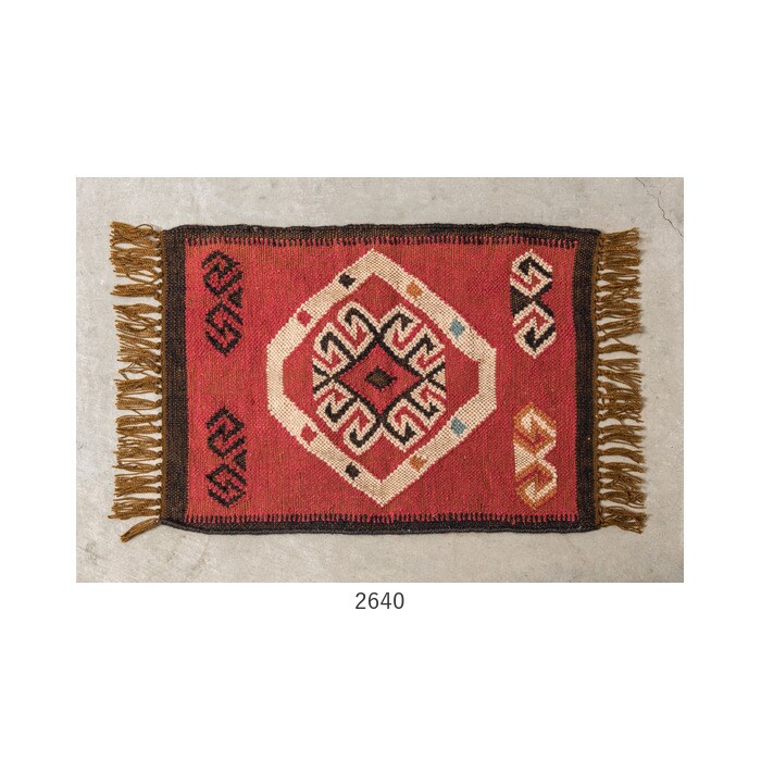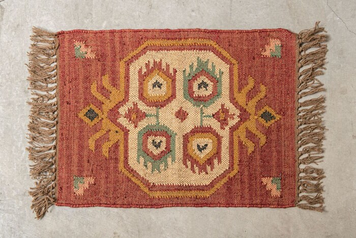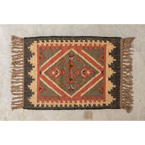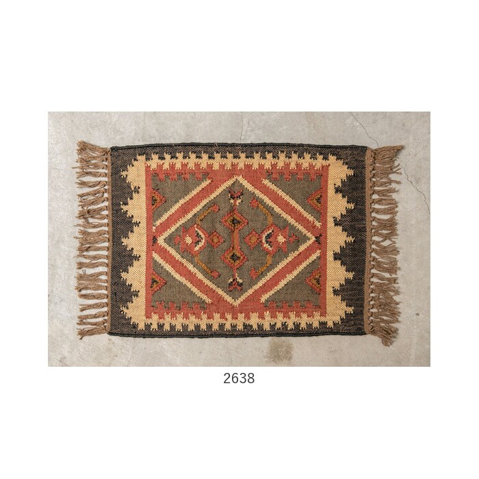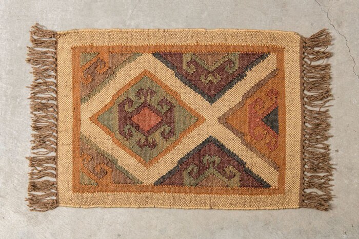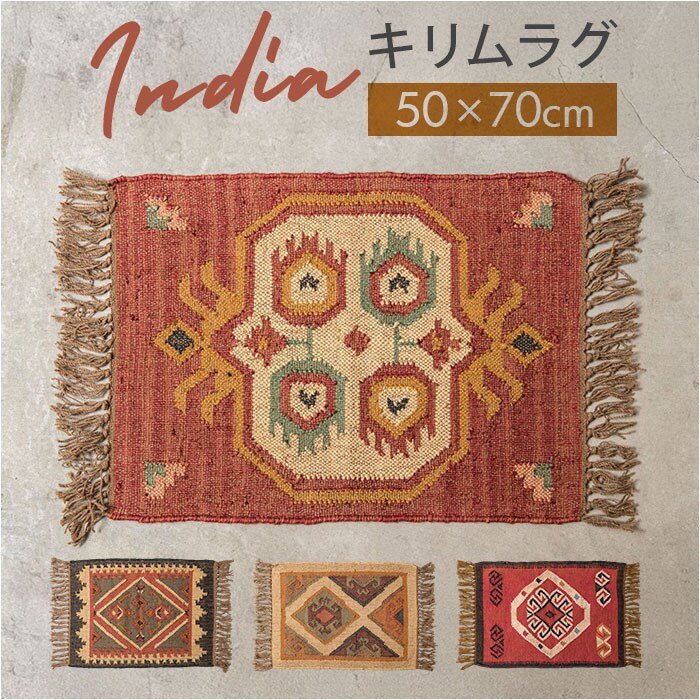 | 商品説明 | 再生ペットボトルの糸を使用したインドキリムラグ。再生糸の柔らかさの幾何学模様やトライバルデザインは室内外でご使用可能。 |