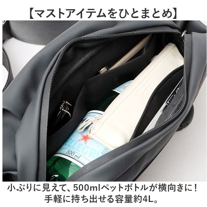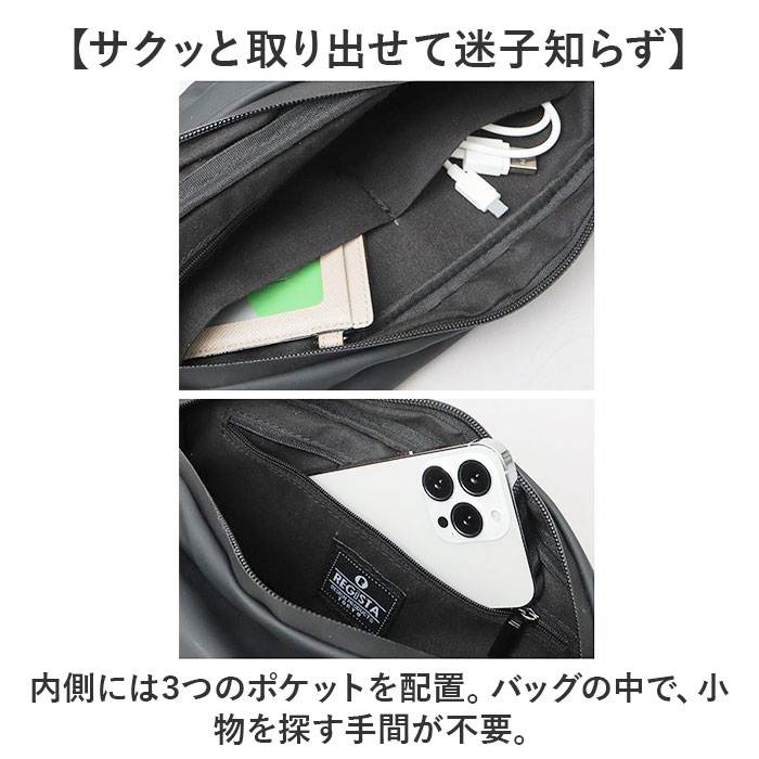 | 商品説明 | 【色んなシーンで頼りになる相棒】タウンユースからアウトドアまでお任せ◎「REGiSTA ターポリン ボディバッグ」。【耐久性&撥水性に優れたターポリン】表面は防水仕様のポリエステル製、マットなターポリン生地。急な雨や水濡れも安心。(※1)完全防水ではありません。【水が入りにくい止水ファスナー】外側の各ファスナーは、水の侵入を防ぐ止水仕様。雨の中での外移動が多い日にも最適。【ガバっと開くダブルファスナー】メインは左右どちらからもオープン。中身を確認しやすく、出し入れスムーズ。【マストアイテムをひとまとめ】小ぶりに見えて、500mlペットボトルが横向きに!手軽に持ち出せる容量約4L。【サクッと取り出せて迷子知らず】内側には3つのポケットを配置。バッグの中で、小物を探す手間が不要。【斜めファスナーのフロントスペース】フロントスペースを設けた2層式。斜めファスナーで開閉、立体感がありやや厚みのある小物も。【便利な背面ポケットを配置】背面には大きめのスマホなども収まるポケットを。移動中もすぐに取り出せる◎【両手が空いてストレスフリー】ショルダーの長さを調節して斜め掛けでき、移動の多い日も快適。着脱もバックルでワンタッチ!【スタイルを邪魔せずスッキリ】余ったショルダーベルト部分は、ボディと同素材のベルトループにまとめて邪魔にならない◎【長時間の移動でも快適な背負い心地】バッグ背面に厚みのあるクッション材を入れ、荷物が当たるのを軽減。【ディテールにもこだわりをプラス】各ファスナーの引手は、ブランドロゴを入れたオリジナルパーツ。開閉しやすい大きめサイズ。【お好みで選べる2タイプをご用意】糸の織り目のような生地目が特徴のパターンと、クセのないスタンダードなスムース。【飽きのこないシンプルデザイン】無駄な装飾を省いた、スタイリッシュな仕上がり。様々なコーディネートに素敵にマッチ。【ファッションを楽しむレジスタ】スタンダードなデザインをベースにしつつ、トレンドを意識。使いやすいバッグがコンセプト。 |