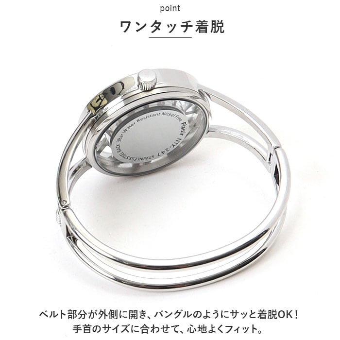 | サイズ | [バングル内周]約16cm/[バングルの幅]約1.1cm/[枠を含む文字盤の直径]約3.5cm ※開け口は最大約10cmまで広げることが可能です。 ※サイズはメーカー公表サイズです。実際の商品とは多少の誤差が生じる場合がございます。あらかじめご了承ください。 |
