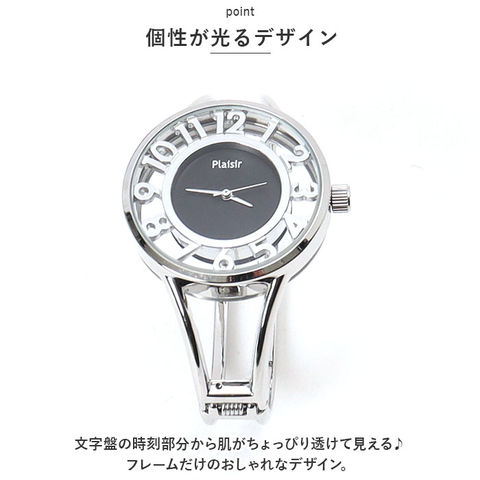 | 商品説明 | オン・オフ問わず活躍する腕時計。Plaisir(プレジール) ニッケルフリーバングルウォッチが新登場。【ワンタッチ着脱】ベルト部分が外側に開き、バングルのようにサッと着脱OK!手首のサイズに合わせて、心地よくフィット。【個性が光るデザイン】文字盤の時刻部分から肌がちょっぴり透けて見える♪フレームだけのおしゃれなデザイン。【存在感のある文字盤】大きめな文字盤デザインもポイント。くり抜かれた数字が見やすく、文字盤ケース横のつまみで簡単に時刻調節が可能。【お肌が敏感な方でも安心】お肌に優しいニッケルフリー仕上げ。(※すべての方に金属アレルギーが出ないことを保証するものではありません。)【ころんと丸みのあるフォルム】アクセサリー感覚で身につけられるから、コーデのアクセントにも☆【お好みをチョイス】上品な光沢のあるカラーをラインナップ。どんなコーデとも相性ばっちり。 |