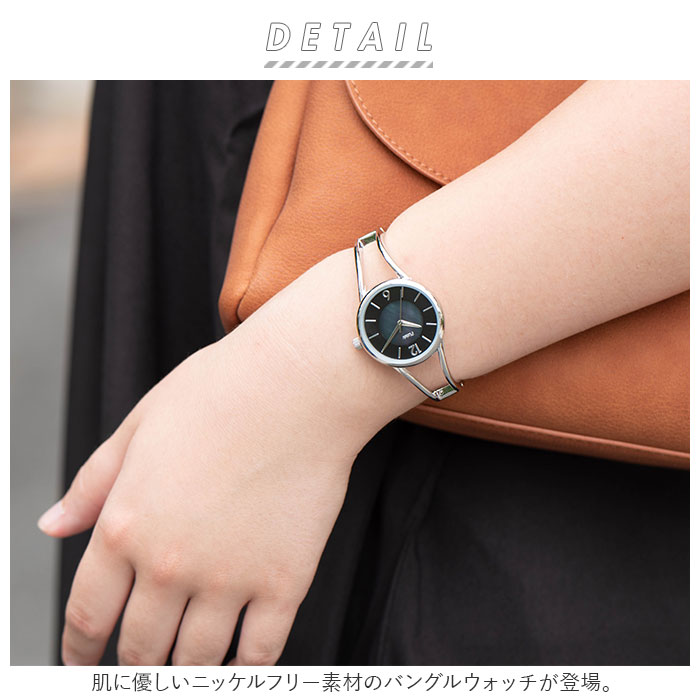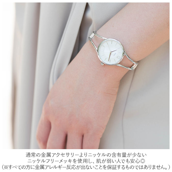 | 商品説明 | 肌に優しいニッケルフリー素材のバングルウォッチが登場。通常の金属アクセサリーよりニッケルの含有量が少ないニッケルフリーメッキを使用し、肌が弱い人でも安心◎(※すべての方に金属アレルギー反応が出ないことを保証するものではありません。)バングルタイプなので、着脱しやすく、調整の必要もなし!バングルは二本のラインが印象的な透かしタイプ。華奢見えし大人っぽい雰囲気に。文字盤にはパールの母貝でもある白蝶貝を使用!光の当たり具合により光沢感が変わり高級感のある上品なイメージを演出。12時、6時以外はバーインデックスを採用しスマートな印象に。短針・長針もこだわりある繊細なデザイン仕上げ♪安心の日本製ムーブメント。年代を選ばないオシャレなつくり!いつものコーデやビジネス、フォーマルシーンも活躍するアイテム。 |