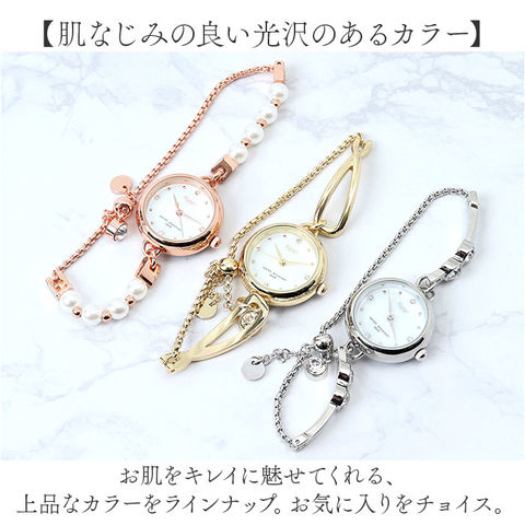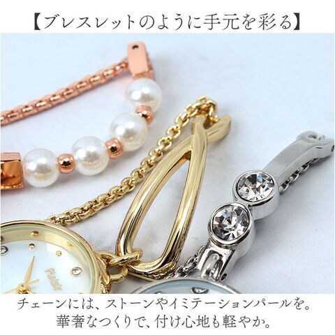 | 商品説明 | 【アクセサリー感覚でおしゃれに】フェミニンな雰囲気漂う♪「Plaisir ニッケルフリーウォッチ」が新登場。【ブレスレットのように手元を彩る】チェーンには、ストーンやイミテーションパールを。華奢なつくりで、付け心地も軽やか。【手軽に使える日常生活防水タイプ】うれしい3気圧防水(日常生活防水)仕様。洗顔時・小雨などに一時的に濡れる程度なら大丈夫。(※1)水仕事中、プールやお風呂場などでのご使用は故障の原因となるため、お控えください。【ニッケルフリーでお肌が敏感な方に】ニッケルをほぼ含まず、お肌に優しいのもポイント。安心して使えるアイテム◎(※2)すべての方に金属アレルギーが出ないことを保証するものではありません。【スライドチェーンで簡単自分サイズ】チェーンの端を指で押さえ、留め具を引いて長さを調節し留めるだけ。手首に心地よくフィット!【安心の日本製ムーブメント】ムーブメントは高い性能を誇る日本製。1秒ごとに時を刻むステップ秒針。【肌なじみの良い光沢のあるカラー】お肌をキレイに魅せてくれる、上品なカラーをラインナップ。お気に入りをチョイス。【大切な方への贈り物にもおすすめ】中身が見える、中央クリア仕様のボックス入り。新生活や誕生日などのお祝いにぴったり。 |