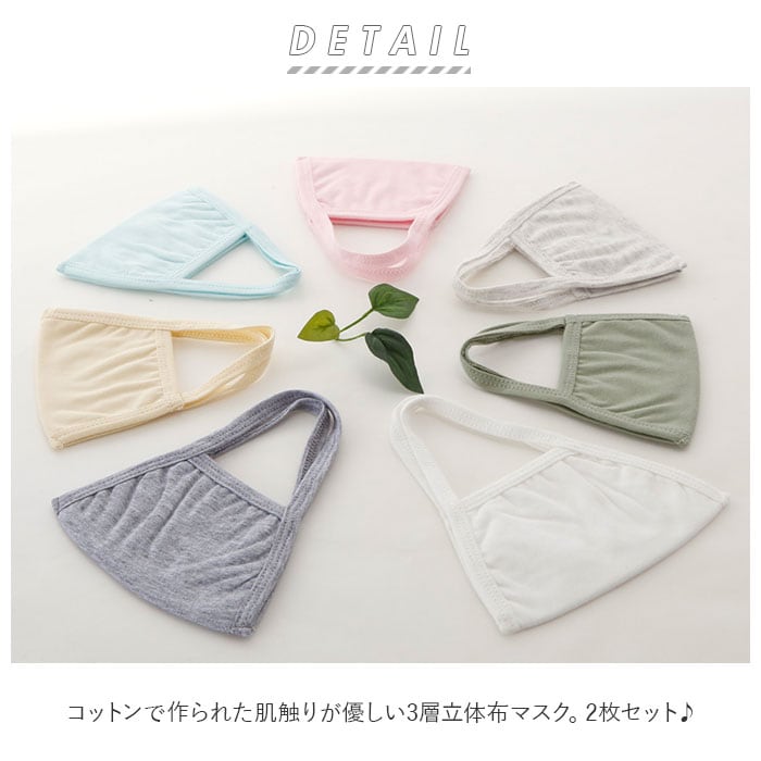 | 商品説明 | コットンで作られた肌触りが優しい3層立体布マスク。2枚セット♪本体と耳掛け部分は一体型になっていてオシャレ☆100%綿で作られているから肌触りが良く、洗濯もできるから繰り返し使える。立体構造だから、口周りに自然にフィットして苦しくない♪3層構造で、ホコリや花粉の侵入を防げる。※この商品は同色2枚セットです。 |