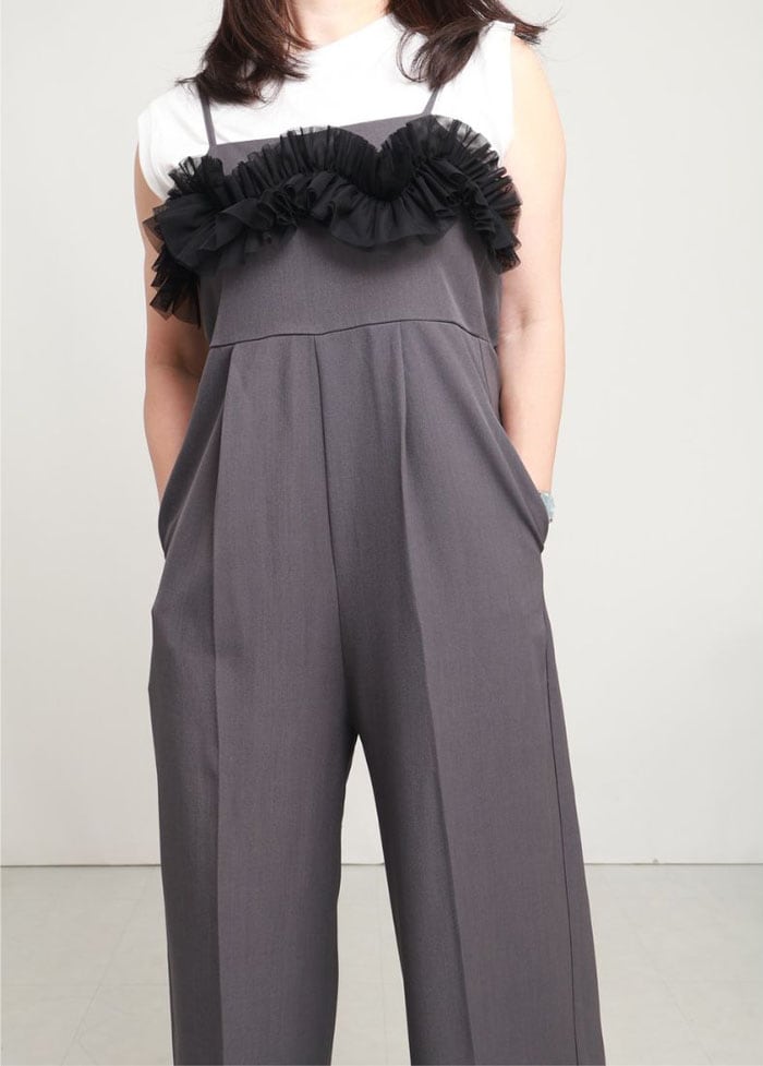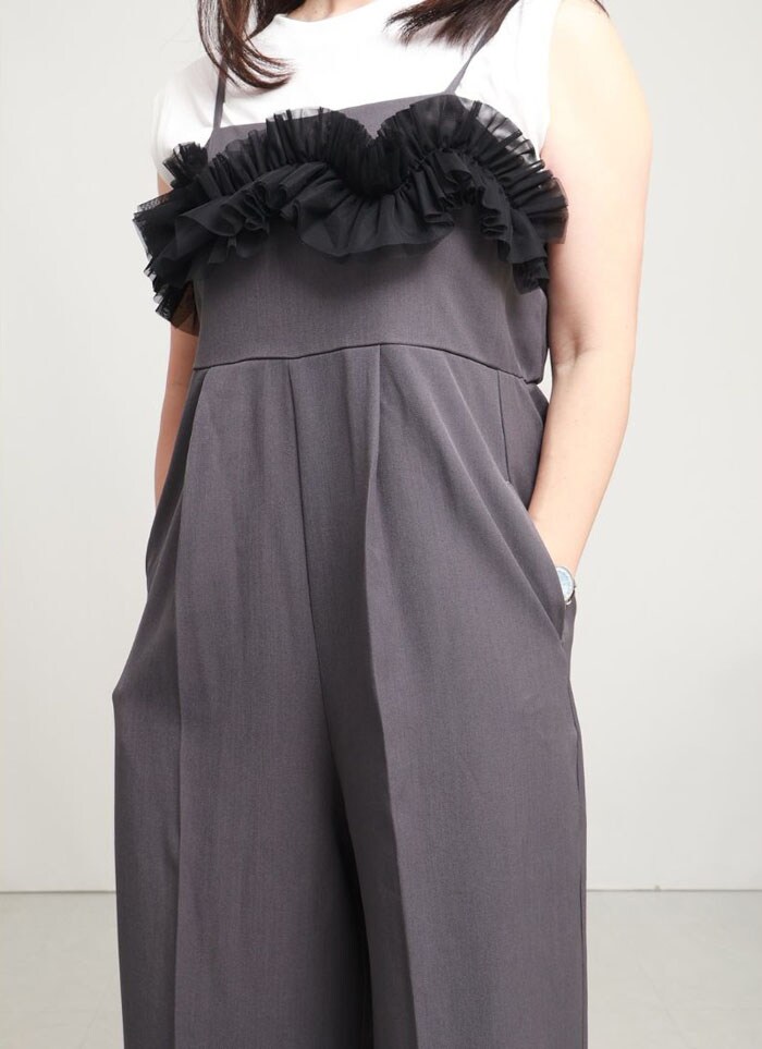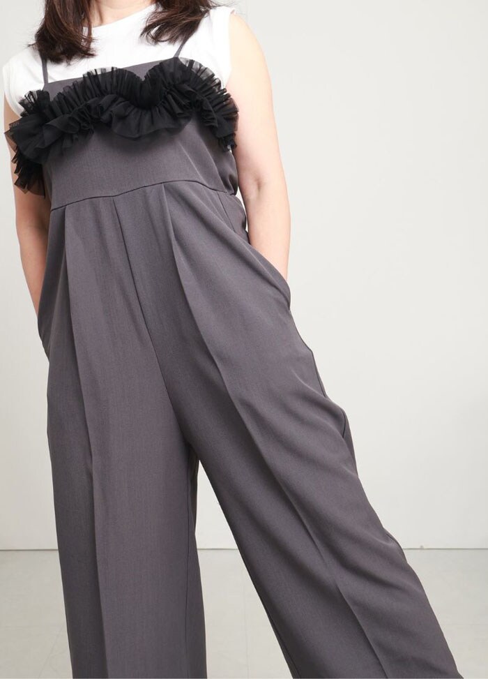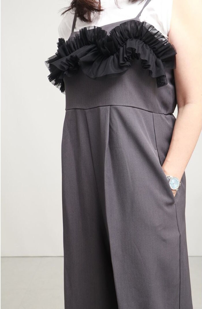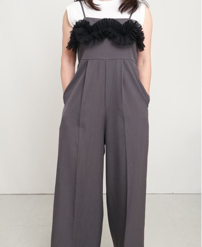 | 商品説明 | 大人のリラックスコーデに胸元にあしらわれたチュールがポイントのオールインワンノースリーブやTシャツを合わせたりジャケツとや羽織ものと合わせてもかわいい!ラクに着れて、大人かわいくなれるアイテム夏のおでかけやご旅行にもぴったり!※肩紐はアジャスターで調整可能 |
