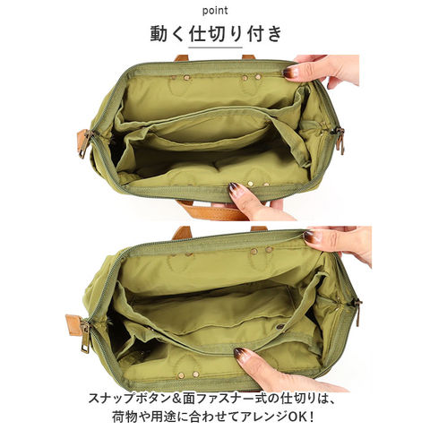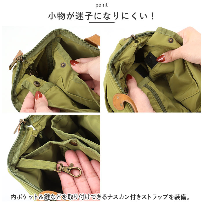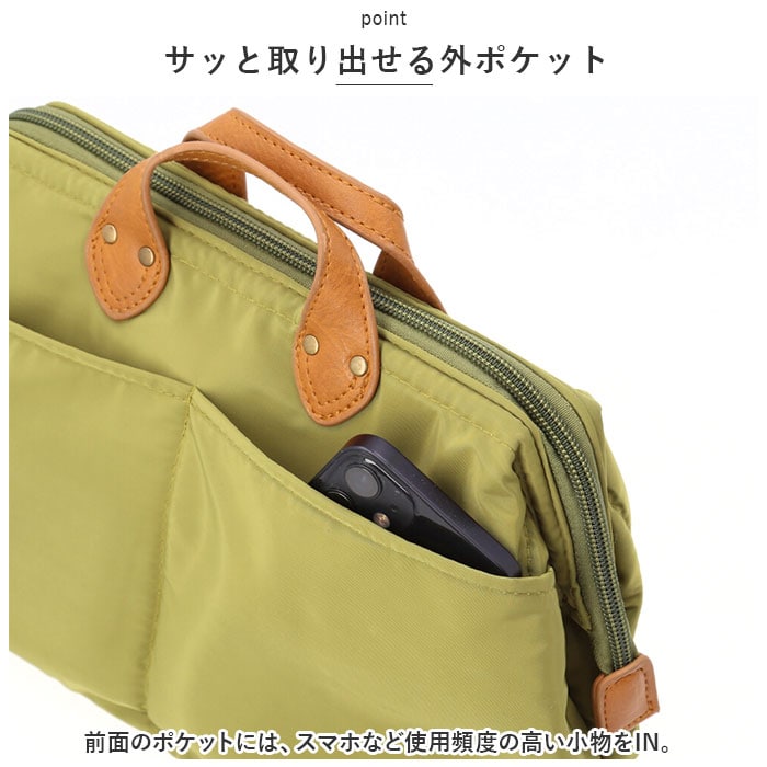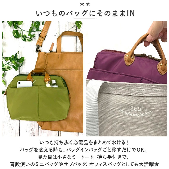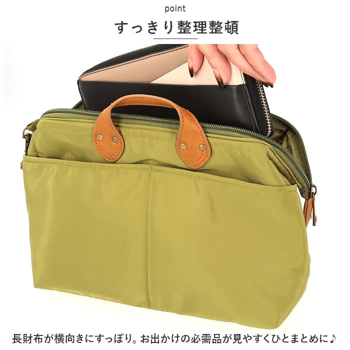 商品説明Lafiel(ラフィール)から、使い勝手抜群なナイロン調ワイヤーバッグインバッグが登場。【いつものバッグにそのままIN】いつも持ち歩く必需品をまとめておける!バッグを変える時も、バッグインバッグごと移すだけでOK。【ナイロン調生地に大人感をプラス】サラッと滑りの良いナイロン調素材で、バッグからの出し入れがスムーズ。シンプルな無地カラーにハンドル部分などの合皮使いがアクセント。【口金ワイヤー入り】開口部はダブルファスナー&口金ワイヤー入りで、ガバっと大きく開くつくり。【動く仕切り付き】スナップボタン&面ファスナー式の仕切りは、荷物や用途に合わせてアレンジOK!【すっきり整理整頓】長財布が横向きにすっぽり。お出かけの必需品が見やすくひとまとめに♪【安定感もばっちり】程よいマチ&取り外し可能な底板付き。しっかり自立し、安定した状態で持ち運び可能。【小物が迷子になりにくい!】内ポケット&鍵などを取り付けできるナスカン付きストラップを装備。【サッと取り出せる外ポケット】前面のポケットには、スマホなど使用頻度の高い小物をIN。【扱いがラクラク】ふわっと軽い生地感。使わない時はスリムに折りたためたり、扱いやすさも魅力の1つ。【単体使いも】見た目は小さなミニトート。持ち手付きで、普段使いのミニバッグやサブバッグ、オフィスバッグとしても大活躍★【ポケット仕様】メインルーム:ファスナーポケット×1、オープンポケット×3前面:オープンポケット×2
