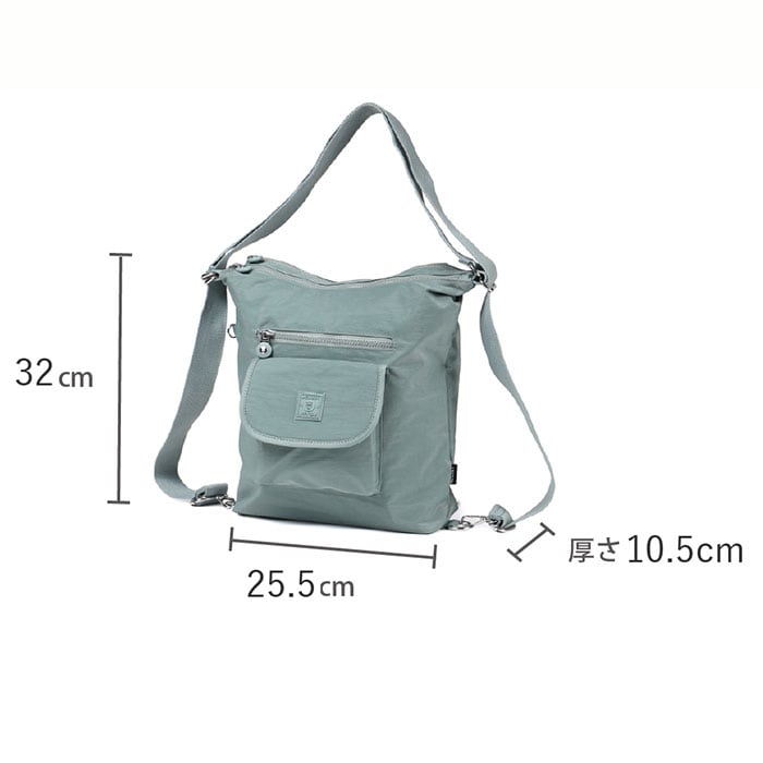 | サイズ | [縦]約32cm/[横(底部)]約25.5cm/[マチ]約10.5cm [ショルダー最長]約80cm(調節可能)/[リュック使用時ショルダー最長]約100cm(調節可能) ※サイズは当店計測の実寸サイズです。実際の商品ならびにメーカー表記サイズとは多少の誤差が生じる場合がございます。あらかじめご了承ください。 |