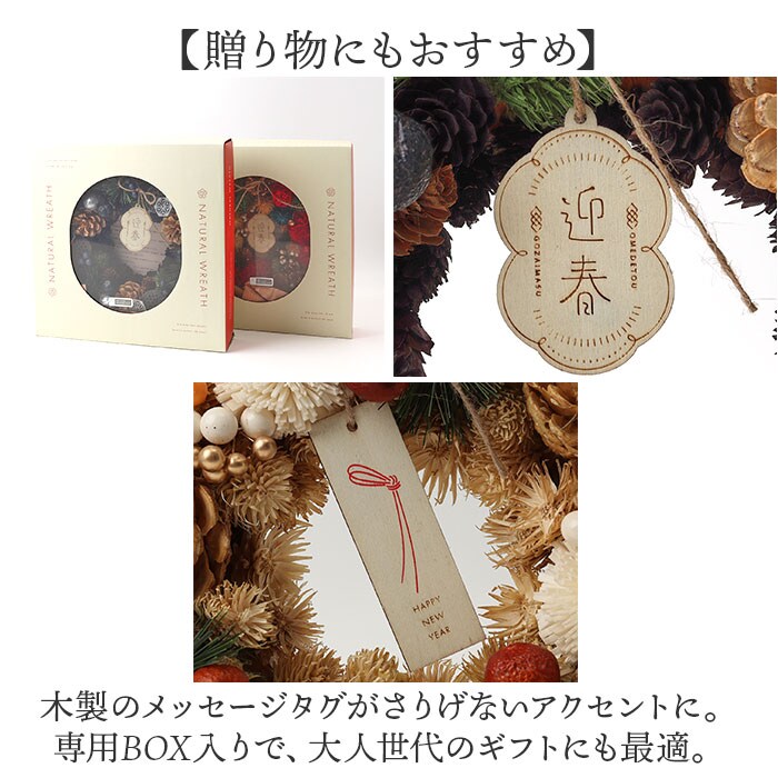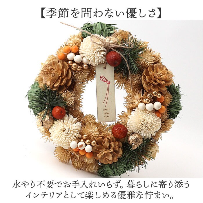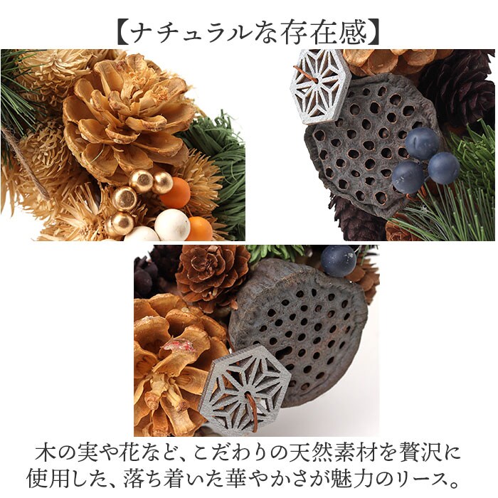 | 商品説明 | 【迎春にふさわしい彩り♪】天然素材のぬくもりで新年を迎える準備にぴったりな「ジャパネスクリース M」が登場。【ナチュラルな存在感】木の実や花など、こだわりの天然素材を贅沢に使用した、落ち着いた華やかさが魅力のリース。【季節を問わない優しさ】水やり不要でお手入れいらず。暮らしに寄り添うインテリアとして楽しめる優雅な佇まい。【玄関にも映える上品さ】和洋問わずどんな空間にも自然と馴染み、玄関やリビングにやさしく華を添えるナチュラルカラー。【贈り物にもおすすめ】木製のメッセージタグがさりげないアクセントに。専用BOX入りで、大人世代のギフトにも最適。 |