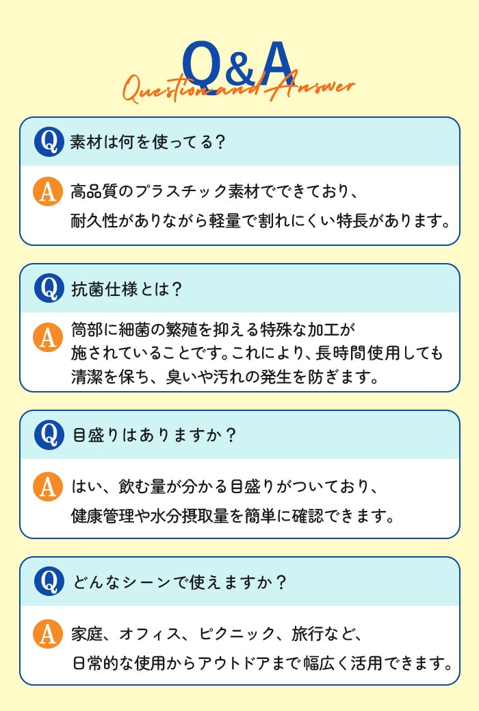 | 素材 | 【本体】ポリエステル 【フタユニット】 [リングトップ]TPE [フタ]ポリプロピレン [パッキン]シリコーンゴム 【飲み口ユニット】 [飲み口]ポリプロピレン [パッキン]シリコーンゴム ※[付属品]取扱説明書 |