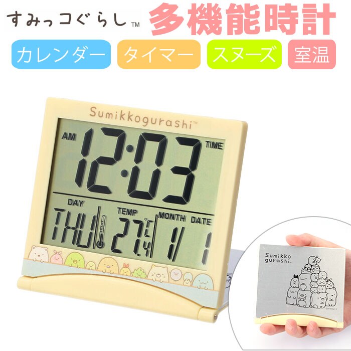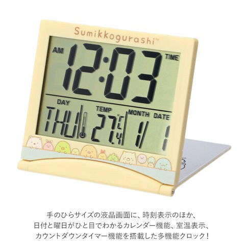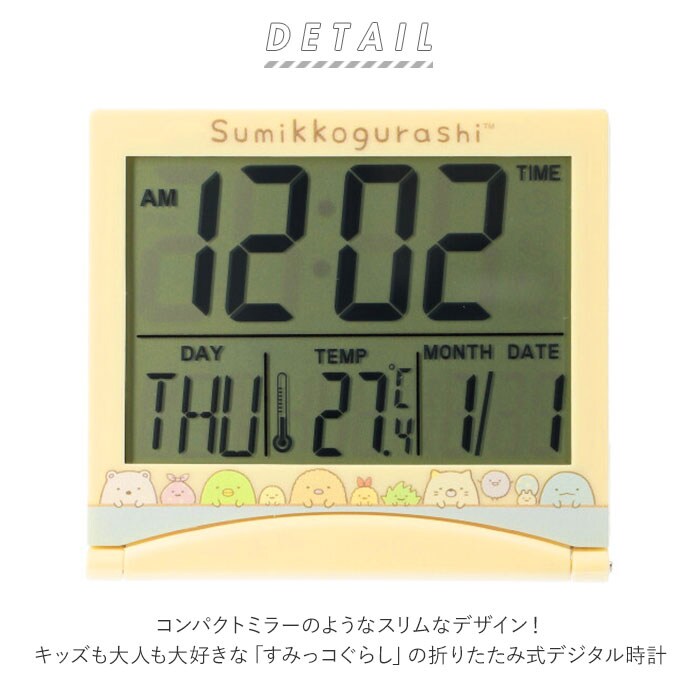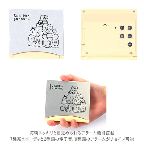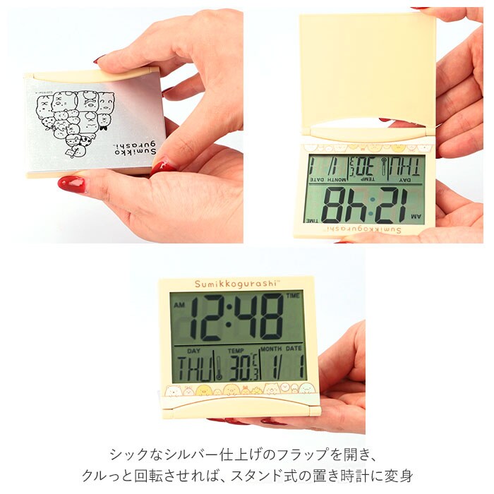 商品説明コンパクトミラーのようなスリムなデザイン!キッズも大人も大好きな「すみっコぐらし」の折りたたみ式デジタル時計。手のひらサイズの液晶画面に、時刻表示のほか、日付と曜日がひと目でわかるカレンダー機能、室温表示、カウントダウンタイマー機能を搭載した多機能クロック!シックなシルバー仕上げのフラップを開き、クルっと回転させれば、スタンド式の置き時計に変身。毎朝スッキリと目覚められるアラーム機能搭載。7種類のメロディと2種類の電子音、9種類のアラームがチョイス可能。繰り返しアラームでお目覚め時刻を知らせてくれる、お寝坊さんにうれしいスヌーズ機能付き。厚みわずか1.3cm程度のスリム&コンパクト設計なので、カバンやジャケットのポケットにすっぽりと入り、持ち運びスマート!可愛らしいイラスト付きボックスパッケージで、お子さまやお孫さまへのプレゼントに最適。CR2025ボタン型電池×1個使用。(※電池は別売りです。)