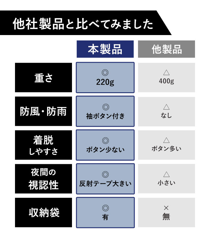 | 商品説明 | 後ろ側に反射素材が付いています。フード巾調節可能です。スナップボタンを留めると袖の様になります。 |