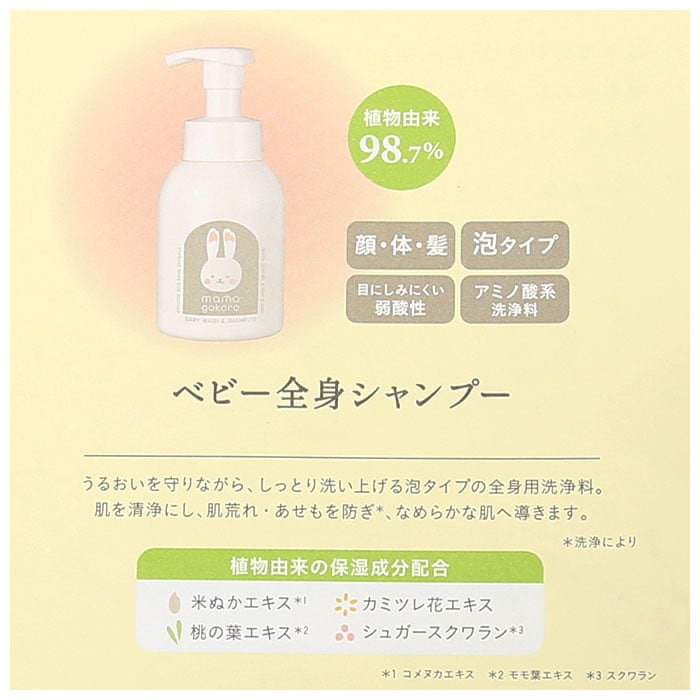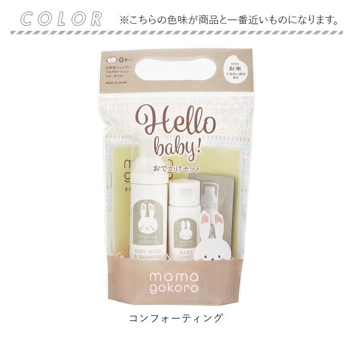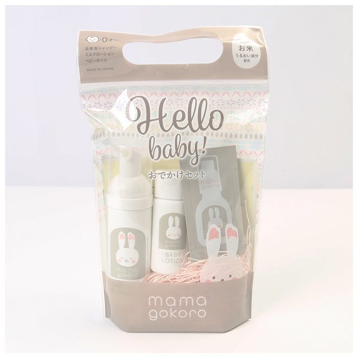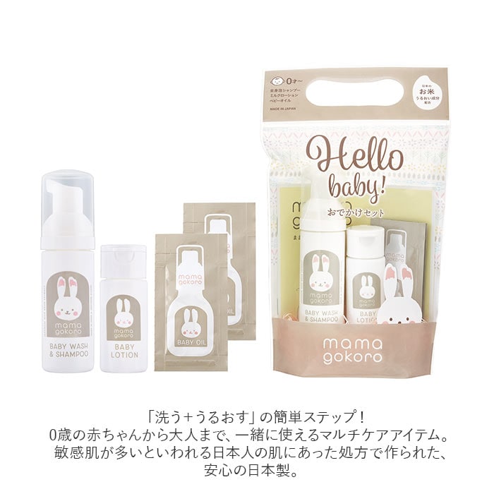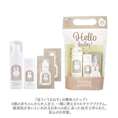 | 商品説明 | 子供たちにすこやかに育ってほしい・・・。mamagokoro(ままごころ)は、ママの気持ちから生まれたブランド。初めてのおでかけやお泊まりにもぴったり♪ミニサイズのベビー全身シャンプー、ベビーミルクローション、ベビーオイル(袋タイプ)の3点セット。・「洗う+うるおす」の簡単ステップ!0歳の赤ちゃんから大人まで、一緒に使えるマルチケアアイテム。敏感肌が多いといわれる日本人の肌にあった処方で作られた、安心の日本製。日本人の体をつくる源である、日本のお米に着目!デリケートな赤ちゃんに負担が少なく、植物のチカラを引きだす処方で肌をしっかり保湿。そのほか、素肌をサポートするカミツレ花エキス、肌荒れをケアする桃の葉エキス、シュガースクワラン・天然精油を配合。食物アレルゲン由来成分不使用!さらに7つの成分を無添加にすることで、生まれたての赤ちゃんの肌や大人の敏感肌にも使える優しい仕様。(※7つの無添加とは・・・鉱物油・石油系界面活性剤・合成香料・合成着色料・シリコン・パラベン・フェノキシエタノール不使用であることを示しています。)赤ちゃんが生まれた方へのプチギフトにもおすすめ。・【ベビー全身シャンプー】植物由来98.7%!うるおいを守りながら、しっとり洗いあげるアミノ酸系全身洗浄料。顔・体・髪に使用可能。目にしみにくい弱酸性の泡タイプ。肌荒れ・あせもを防ぎながら、なめらかな肌に導く♪・【ベビーミルクローション】植物由来99.8%!さらっと伸びて、みずみずしくうるおう保湿ローション。肌が本来もっているチカラをサポートし、健やかな肌を育むオールインワンタイプ。顔・体に使用可能。・【ベビーオイル】植物由来99.5%!心地よくなめらかに伸びて、しっとり保護◎顔・体・髪に使用可能!肌をやわらげ、乾燥や外部刺激から守ってくれる美容オイル。ベビーマッサージにも使用OK。 |