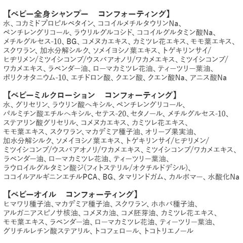 | 容量 | [内容量] 【ベビー全身シャンプー コンフォーティング】50ml 【ベビーミルクローション コンフォーティング】30ml 【ベビーオイル コンフォーティング】2ml×2包 |