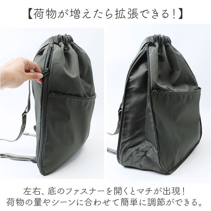 | 商品説明 | 【マチが広がる!便利な拡張タイプ】レジャーなどのお出かけやサブバッグとして大活躍! O.F.S 軽量ナップサックが登場。【荷物が増えたら拡張できる!】左右、底のファスナーを開くとマチが出現!荷物の量やシーンに合わせて簡単に調節ができる。【嬉しい撥水仕様で荷物をガード】突然の雨でも安心の撥水仕様。汚れにも強いので長く使える。※完全防水ではありません。【肩が痛くならないのがポイント】一般的なナップザックよりも太めの肩紐!食い込みにくいので、快適に持ち歩き◎【ファスナーポケットを搭載】荷物の仕分けができる、フロントポケットを搭載。中身が飛び出さないファスナーつきで安心。【ナップザップ風のシンプルさが魅力】紐をキュッと絞って使うナップザップ。お子様も一人で扱いやすい、シンプルな使い心地。【軽量だからサブバックにも◎】約175gと超軽量!メインとしてはもちろん、折りたたんでサブバックとしてのち歩くのも◎ |