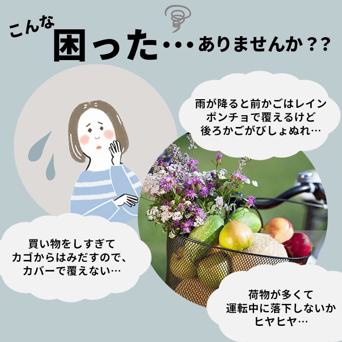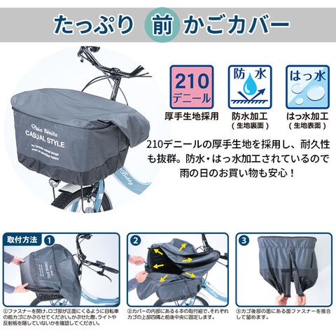 | 注意点 | 前カゴ用カバーは、大きな角型・ワイド型等、電動アシスト自転車の大きめなカゴにも対応。(特殊なカゴには取り付けできな場合があります。)汚れは水またはぬるま湯で洗い流して下さい。もみ洗い等は避けて下さい。洗剤のご使用はおやめ下さい。鋭利なもので突いたり、引っかいたりしないでください。本製品は完全防水ではありません。サイズより大きなカゴに無理矢理かぶせないで下さい。破れる可能性があります。ひったくり防止や抑止には効果がありますが、安全ではありませんので、貴重品などの管理はご自身にて行って下さい。自然光などにより、通常のご使用でも若干の変退色がおこります。カメラやモニターの性質により、画像と実物の色の違いがある場合がございますのでご理解願います。 |