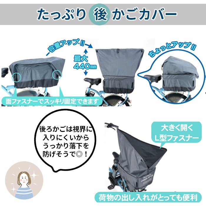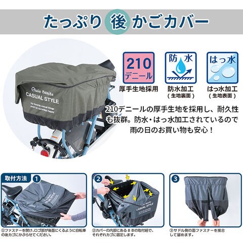 | サイズ | 【前カゴカバー】 ・取付け可能カゴサイズ(通常サイズ) [高さ]約29cmまで [全周]141cmまで ・容量アップ時のサイズ [高さ]約70cm(通常時:約29cm+伸長分:約41cm) [上部最大幅]約71.5cm 【後ろカゴカバー】 ・取付け可能カゴサイズ(通常サイズ) [高さ]約29cmまで [全周]155cmまで ・容量アップ時のサイズ [高さ]約73cm(通常時:約29cm+伸長分:約44cm) ・容量アップ時、前後最大幅:約78.5cm ※サイズは当店平置き実寸サイズです。実際の商品とは多少の誤差が生じる場合がございます。あらかじめご了承ください。 |