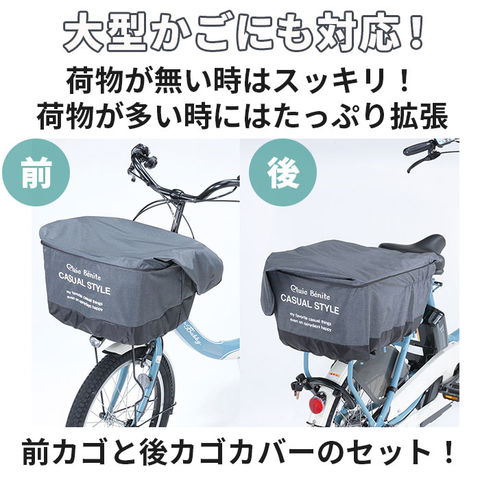 | 商品説明 | 荷物が無い時はスッキリなスタイル。荷物が多い時にはたっぷりふくらむ自転車前カゴと後カゴカバーのセット。周囲がゴムになっているので、かごにすっぽり被せて、取り付け紐で結び、面ファスナーでスッキリ固定できる仕様。前カゴと後カゴカバーどちらも大きく開くL型ファスナーで荷物の出し入れがラクラク。さらにカバーが上に大きく広がって容量がUP!たっぷり荷物が収納できる。前カゴは大きな角型ワイド型に対応。後ろカゴは大型カゴに対応。210デニールの厚手生地を採用し、耐久性も抜群。防水はっ水加工されているので、雨の日のお買い物も安心! |