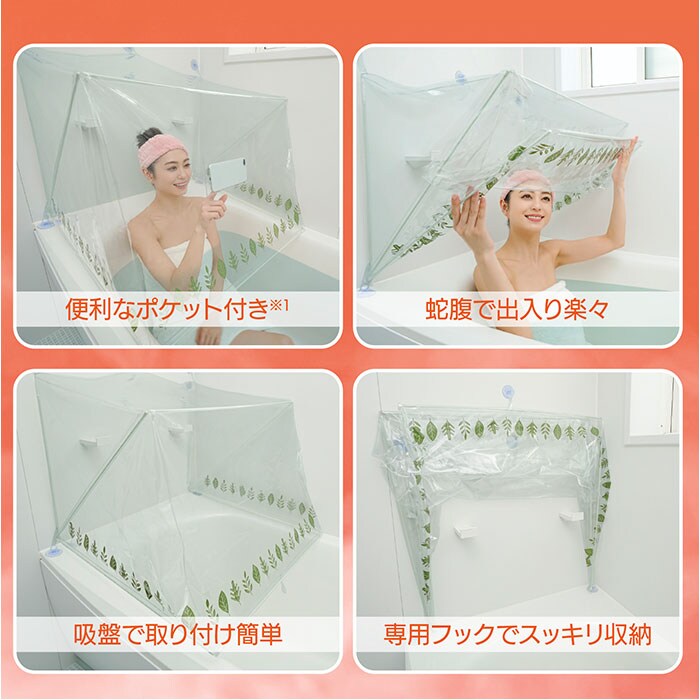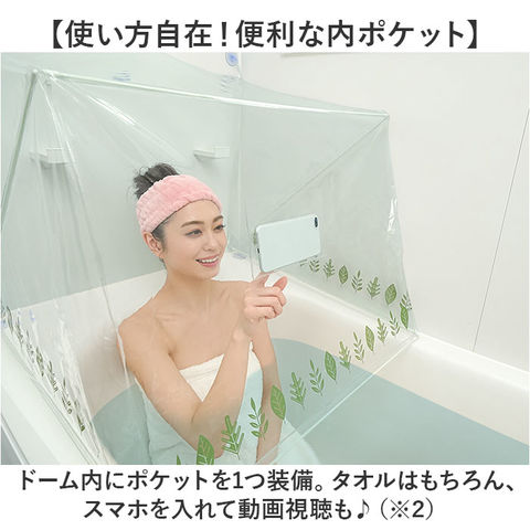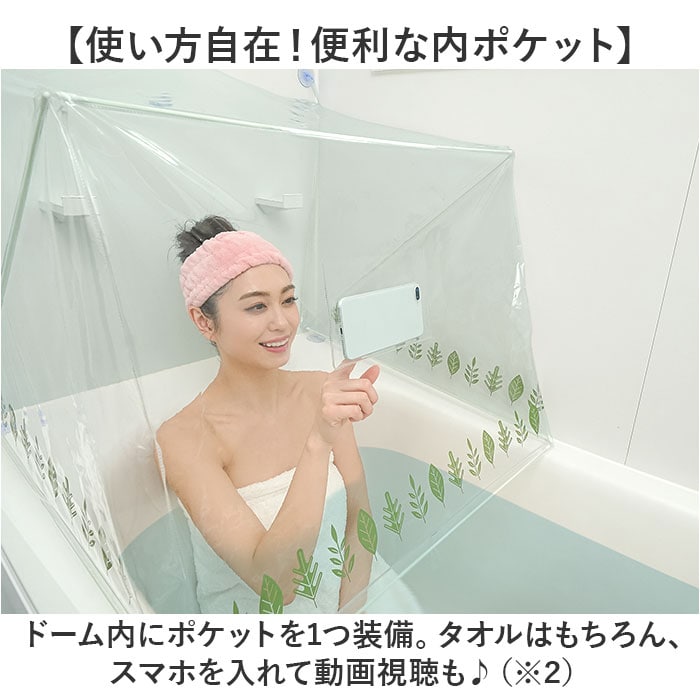 | 商品説明 | 【自宅で本格サウナ気分を満喫♪】いつものお風呂がサウナ空間に。手軽にととのう「お風呂で発汗 サウナドーム」が新登場。【サウナの良さをご家庭で体感】発汗することで、ストレス解消や健康的な体作りをサポート。そんなサウナを自宅で楽しめる!【工具不要でどなたでも簡単設置】付属の吸盤を使って、壁や浴槽の縁に貼り付けるだけ。手軽に使えるのが嬉しい!【設置は1度だけ。片付け要らず】付属の専用フックを貼り付け、ループを掛けてすっきり収納。都度設置する手間がなく快適。(※1)付着した結露や水滴を拭き取ってから収納してください。【男女兼用!広々ドームタイプ】ゆったり入れて開放感のあるドーム型。パタッと大きく開くじゃばら構造で、出入りもラクラク。【熱を逃さないPVC製透明カバー】気密性が高く、耐水性・強度に優れたカバー。まるでスチームサウナのように大量発汗。【軽量でサビにも強い骨組み】骨組みにはポリプロピレンを使用。軽やかな使い心地で、サビる心配もなし。【使い方自在!便利な内ポケット】ドーム内にポケットを1つ装備。タオルはもちろん、スマホを入れて動画視聴も♪(※2)スマホは水没の危険があるため、防水ケースを活用するなどご自身で注意の上ご使用ください。【サウナ代がかからずお財布に優しい】サウナへ通うお金を節約◎自宅で何度でも楽しめて、通う時間がない方にもぴったり。【サウナグッズを併用してさらに発汗】もっと汗を出したい方は、お手持ちのサウナポンチョと合わせて使用するのもおすすめ。【ナチュラルで癒やされるリーフ柄】サウナ気分がより盛り上がる!カバーの裾に優しい風合いのリーフデザインをプラス。 |