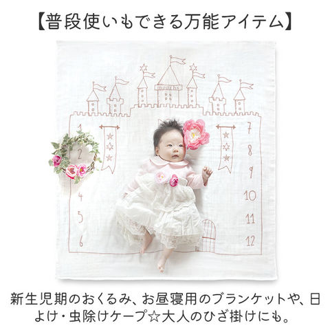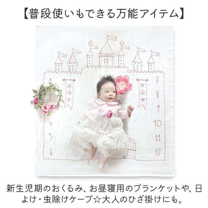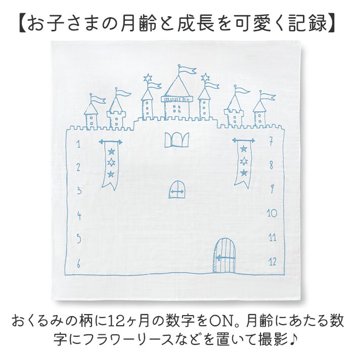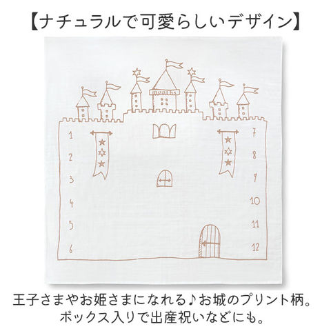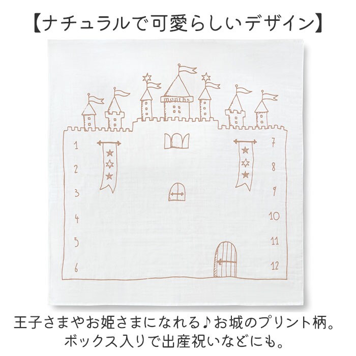 | 商品説明 | 【ベビーのめまぐるしい成長を撮影】毎月の撮影が楽しみに♪家族の思い出を作れる「おくるみ3重ガーゼケット ナンバーパレス」。【お子さまの月齢と成長を可愛く記録】おくるみの柄に12ヶ月の数字をON。月齢にあたる数字にフラワーリースなどを置いて撮影♪【安心安全◎日本製今治ガーゼ】通気性・速乾性・保温性に優れ、高い安全性を誇る◎タオルの産地・今治で丁寧に織り上げ。【デリケート肌にも優しい綿100%】オーガニック糸を使用、ふわりと軽い3重ガーゼ。お肌を優しく包み、洗うほどに風合いが増す♪【普段使いもできる万能アイテム】新生児期のおくるみ、お昼寝用のブランケットや、日よけ・虫除けケープ☆大人のひざ掛けにも。【世界に1つの素敵な宝物が完成】毎月撮りためた写真をプリントし、お手持ちのアルバムや写真立てに。大切な記録をいつまでも♪【月齢の近いお友達と一緒に撮影】折りたたんで、コンパクトに持ち運びOK。お友達と仲良く撮影するのもおすすめ。【ナチュラルで可愛らしいデザイン】王子さまやお姫さまになれる♪お城のプリント柄。ボックス入りで出産祝いなどにも。【丸洗いできてお手入れラクラク】汚れが気になったら、ネットに入れて洗濯機洗い可能。いつも清潔をキープ。(※)乾燥機はお控えください。 |