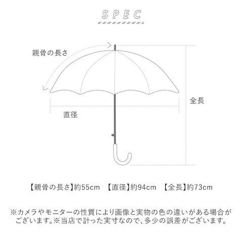 | サイズ | [親骨の長さ]約55cm/[直径]約94cm/[全長]約73cm ※サイズは当店計測の実寸サイズです。実際の商品ならびにメーカー表記サイズとは多少の誤差が生じる場合がございます。あらかじめご了承ください。 |