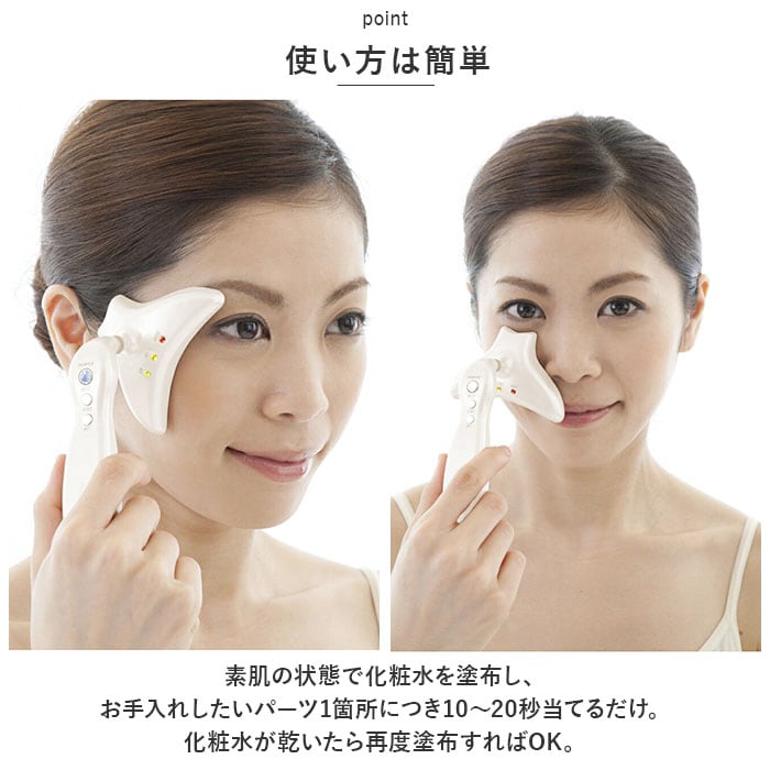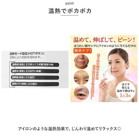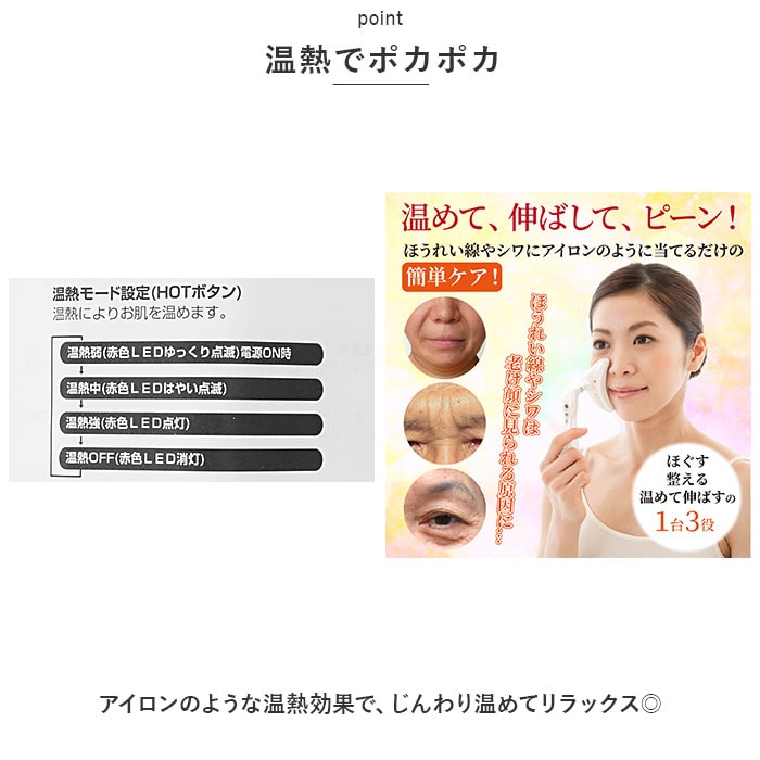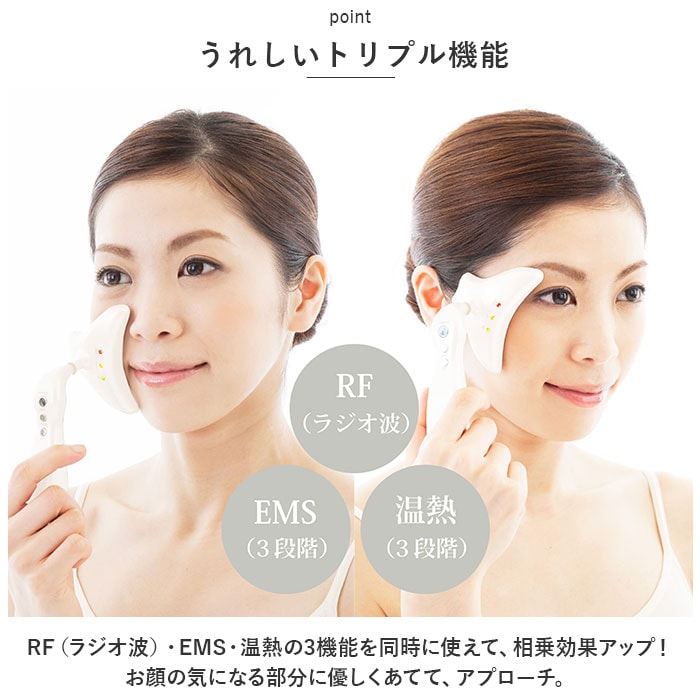 | 商品説明 | アイロンのようにあてて、温めてほぐす♪ほうれい線アイロン「シルクフェイサー」が新登場。【うれしいトリプル機能】RF(ラジオ波)・EMS・温熱の3機能を同時に使えて、相乗効果アップ!お顔の気になる部分に優しくあてて、アプローチ。【振動の摩擦熱によるRF機能】RFの波長の振動でお肌を温め、リフレッシュ♪【EMSの刺激でストレッチ】表情筋を刺激するEMS機能を搭載。お顔の印象を明るくサポート。【温熱でポカポカ】アイロンのような温熱効果で、じんわり温めてリラックス◎【使い方は簡単】素肌の状態で化粧水を塗布し、お手入れしたいパーツ1箇所につき10~20秒当てるだけ。化粧水が乾いたら再度塗布すればOK。【フィット感のある回転ヘッド】ヘッド部分が回転し、左右どの向きにもフィット。ピンポイントでお手入れできて、ストレスフリー。【3段階調節可能】EMSと温熱機能は、弱・中・強の3段階に調節。お肌の状態に合わせて調節できるのが嬉しいポイント。【フェイスケア以外にも】眉間や首、デコルテにも使用できて便利。自宅で手軽にながらケア♪ |