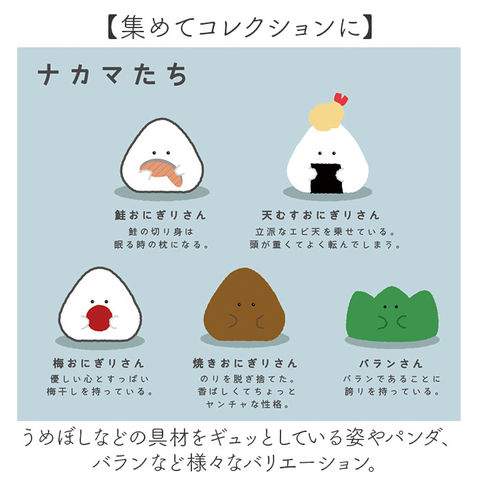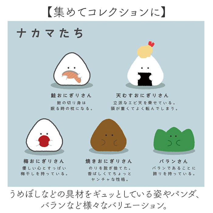 | 商品説明 | 【おにぎりさん大集合】おにぎりさんが大集合♪全15種類のマスコットが新発売♪(対象年齢:6歳以上)【ぎゅっとおにぎりさん】疲れた人の前に現れるおにぎりのような見た目の生き物。おにぎりさんを握れば心もぽかぽか♪【思わず握りたくなる】コンビニなどで売られているおにぎりに近いサイズで、思わずギュッと握りたくなる☆【ずっと触りたくなる】程よいクッション性となめらかで柔らかい毛並みで、ずっと触りたくなる癒しアイテム。【可愛い見た目で映える】可愛い見た目で写真も映える♪お出かけ先やお家でのぬい撮りに。【お子さまのおもちゃに】可愛い見た目とモフモフな質感でお子さまのお気に入りになること間違いなし!【集めてコレクションに】うめぼしなどの具材をギュッとしている姿やパンダ、バランなど様々なバリエーション。 |