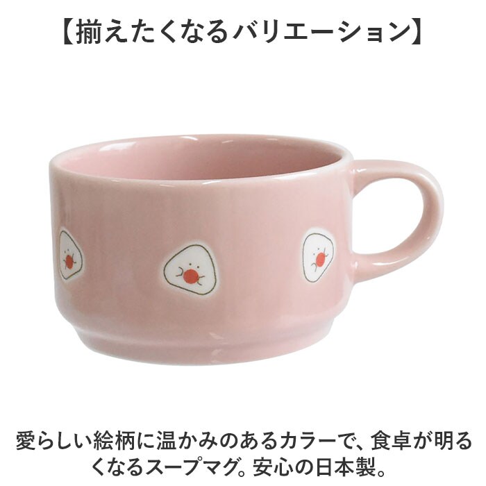 | 商品説明 | 【お気に入りのマグで暮らしを豊かに】モーニングやランチに大活躍!「ぎゅっとおにぎりさん スープマグ」。【疲れた人の前に現れるおにぎりさん】おにぎりのような見た目の生き物☆つぶらな瞳がたまらなく可愛い、仲間たち☆【心もほっこり、癒しのデザイン】やさしい釉薬を使い、絵柄部分は撥水加工で浮かび上がって見えるつくり。【インスタントスープにぴったり】大きすぎない容量300ml。150mlのスープを作る時はマグの半分ほどお湯を注げばOK。(※1)お好みで濃さを調整してください。【電子レンジも食洗機も対応で便利】電子レンジで温め可能、食洗機も使えてお手入れラクチン。扱いやすく、毎日の味方☆(※2)家庭用の電子レンジと食洗機対応です。【スタッキングできて省スペース】複数揃えても、重ねて収納。食器棚の中でも場所を取らず、空間を有効活用。【揃えたくなるバリエーション】愛らしい絵柄に温かみのあるカラーで、食卓が明るくなるスープマグ。安心の日本製。 |