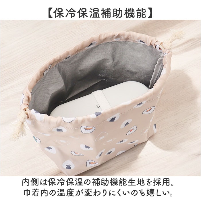 | 商品説明 | 【ランチタイムがより楽しくなる】可愛いマスコットキャラクター「おにぎりさん」が描かれた、ランチ巾着。【ぎゅっとおにぎりさん】疲れた人の前に現れるおにぎりのような見た目の生き物。おにぎりさんを握れば心もぽかぽか♪【保冷保温補助機能】内側は保冷保温の補助機能生地を採用。巾着内の温度が変わりにくいのも嬉しい。【開け閉めスムーズ】開け閉めが楽ちんな巾着タイプ。サッと開けられて、閉じるときは紐を引っ張るだけ。【大人の方でも使えるカラー】くすみ系中心のカラー展開でお子さまはもちろん、大人の方もオススメ♪ |