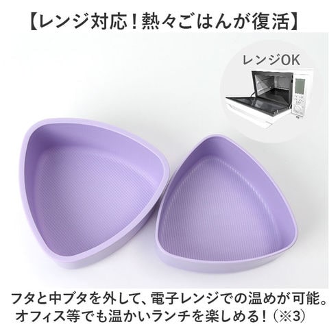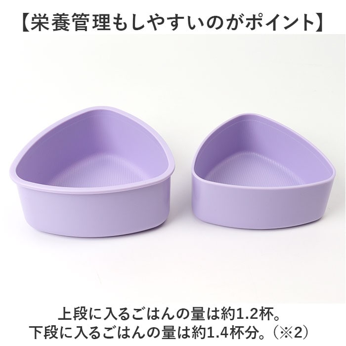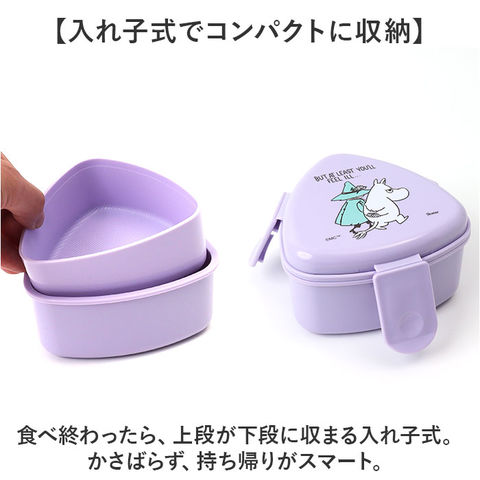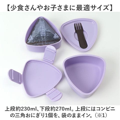 | 商品説明 | 【三角おにぎりとおかずのランチに】コンパクトに分けて持ち運び♪キャラクターデザインが可愛い「三角おにぎりランチボックス」。【少食さんやお子さまに最適サイズ】上段約230ml、下段約270ml。上段にはコンビニの三角おにぎり1個を、袋のままイン。(※1)フタはロック式ですがパッキンは付いていないため、汁気のある食材は避けてください。【栄養管理もしやすいのがポイント】上段に入るごはんの量は約1.2杯。下段に入るごはんの量は約1.4杯分。(※2)お茶碗1杯分は約200ml目安です。【ごはんがくっつかない加工済み】ごはんを直接盛り付けた時も、本体にくっつきにくい!上段、下段ともに加工をプラス。【すっきり収納できるミニフォーク】中ブタにセットしできる、ミニフォークが付属。カトラリーを別で用意しなくても大丈夫♪【レンジ対応!熱々ごはんが復活】フタと中ブタを外して、電子レンジでの温めが可能。オフィス等でも温かいランチを楽しめる!(※3)フォークも取り外してください。【入れ子式でコンパクトに収納】食べ終わったら、上段が下段に収まる入れ子式。かさばらず、持ち帰りがスマート。【お手入れしやすくいつも清潔キープ】全体に抗菌加工を施し、銀イオンの力で細菌の繁殖を抑制。安心の日本製品◎(※4)全ての細菌の増殖を抑制するものではありません。【みんな大好き♪人気キャラクター柄】フタに、キャラクターの絵柄をプリント。プレゼントにもおすすめ! |