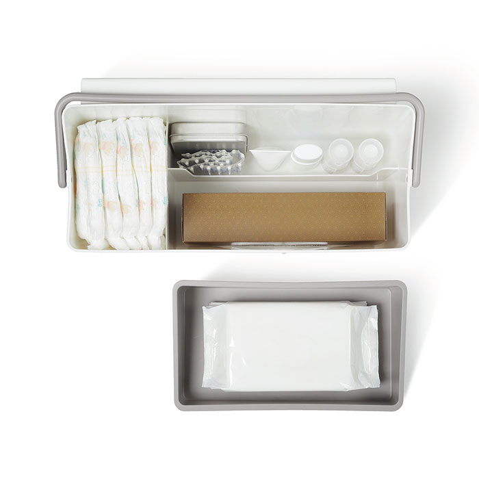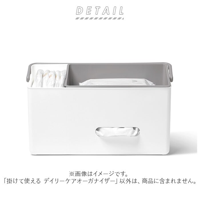 | 商品説明 | like-itから「掛けて使えるデイリーケアオーガナイザー」が発売。オムツやウエットティッシュ、ボックスティッシュなどのケア用品をスリムにひとまとめにできる、お役立ち収納グッズ!持ち運びができるハンドル付きなので、リビングから寝室など、赤ちゃんのケアをする場所に合わせて移動が楽ちん!ボックス型の本体とオープンになったトレーの2段構造。使用頻度の高い小物は、グレー色のトレーに収納すれば取り出しやすい。お薬や綿棒・保湿クリームなど、お子さまに触れさせたくないデリケートなグッズはトレーの下に隠してしまえるからママも安心!本体の左部分には新生児用おむつが約10枚収納可能。本体の前面部分には収納したティッシュやポリ袋をそのまま引き出せる取り出し口付き。背面のフックはベビーベッド等の柵に掛けておけるのもうれしいポイント。(※3cm以内の幅の柵に掛けられます。)約1日分のケア用品がすっきりまとまる!毎日のお子さまのケアがスムーズにできて、ママもパパも笑顔に♪ |