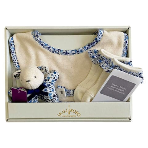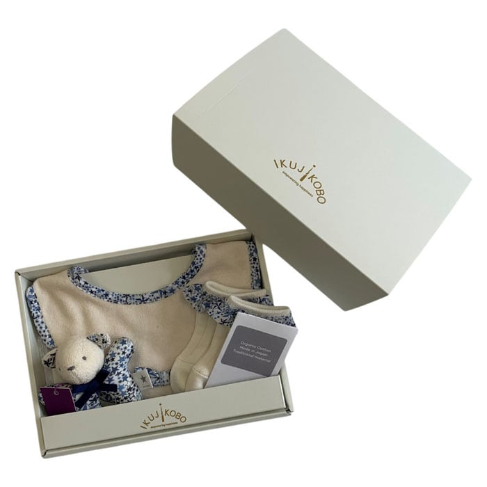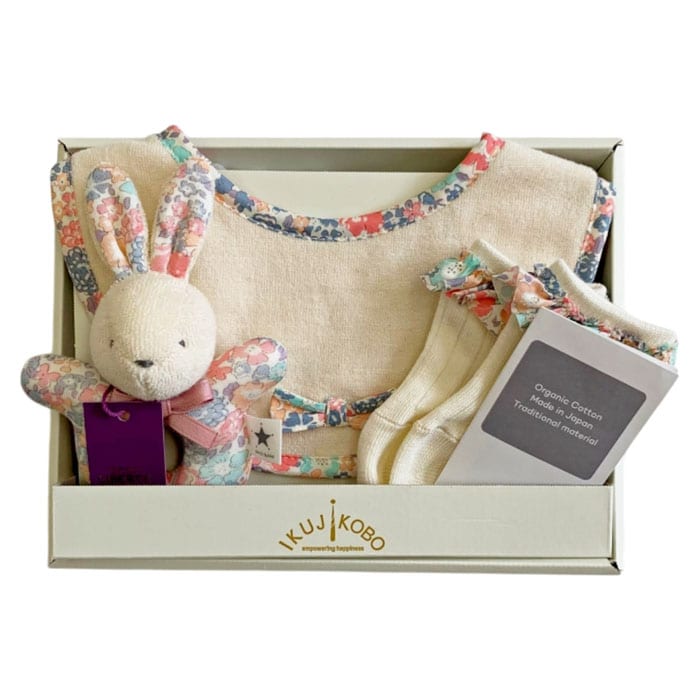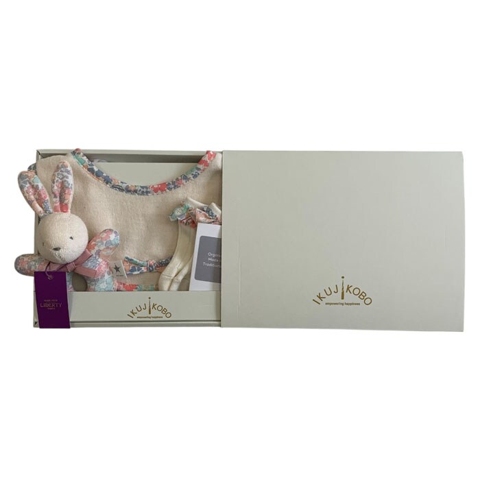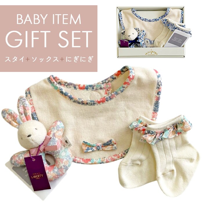 | 商品説明 | ベビーアイテムとして人気のアイテム3点をセットにして専用ボックスに入れたギフトセット。人気のリバティプリントを使用することで、かわいらしさの中にも華やかさのあるアイテムとして人気。 |