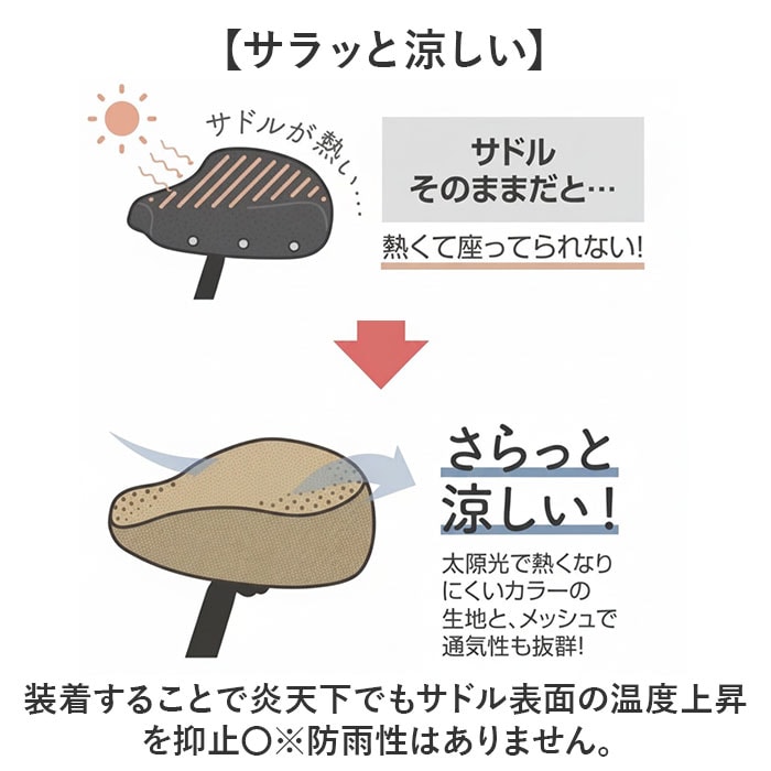 | 商品説明 | 【自転車の猛暑対策】夏場のサドルの「熱っ!」を防ぐ、メッシュサドルカバーが登場。【被せるだけ】付けるだけで熱がこもりにくくなり、メッシュ素材だから通気性も◎【サラッと涼しい】装着することで炎天下でもサドル表面の温度上昇を抑止〇※防雨性はありません。【適合車種】サドルのサイズが縦、横共に29cm~35cmの一般自動車、電動アシスト自転車に適合。※スポーツ車及び特殊サドルには適合しません。【太陽光で熱くなりにくいカラー】お好みのバリエーションから愛車にぴったりのカラーが選べる! |