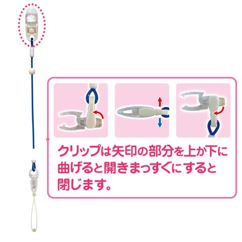 | 注意点 | 用途以外のご使用はお避けください。リングが付いていないおしゃぶりには使用できません。薄い生地にはクリップのとまりが弱く外れる場合があります。また厚い生地に無理にはさむと破損する場合がありますので、ご注意ください。部品がとれたり、破損・変形した場合は直ちに使用を中止してください。お子さまが口などに入れて遊ばないようにご注意ください。使用中はお子さまから目を離さないでください。コードがお子さまの首などに巻きつかないようにご注意ください。クリップで体の部分をはさまないようにご注意ください。はさむ生地にはさみ跡が付く場合があります。傷んで困るものには使用しないでください。火のそばや高温になる場所には置かないでください。ご使用後はお子さまの手の届かない所に保管してください。カメラやモニターの性質により、画像と実物の色の違いがある場合がございますのでご理解願います。 |