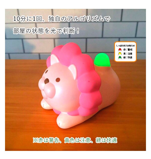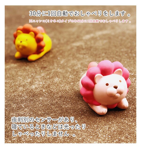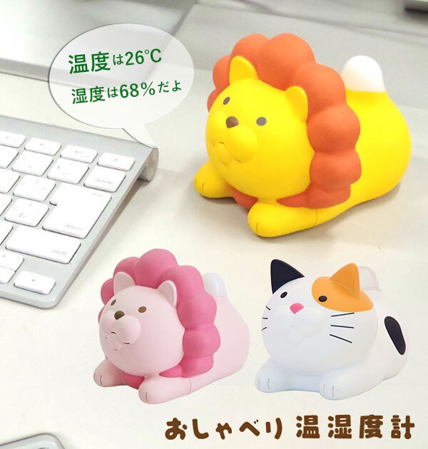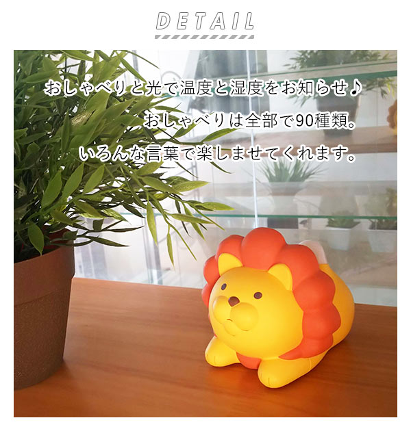 | 商品説明 | おしゃべりとしっぽの光であなたのお部屋の温度と湿度をお知らせ!ライオンとネコのかわいい温湿度計です。あたまを1回なでるように押すと、お部屋の温度湿度を元にしっぽを光らせながらかわいい声でおしゃべりします。2回連続で押すと、お部屋の温度と湿度をお知らせします。さらに30分に1回自動でおしゃべりし、10分に1回しっぽの光でお部屋の状態を判断します。(赤色は警告、黄色は注意、緑色は快適を示しています。)昼夜判別のセンサー付きで、寝ているときなどは光ったりしゃべったりしない賢い機能付き!かわいいお部屋のマスコットとして、夏の熱中症対策や冬の乾燥対策など、お部屋の環境の見直しに楽しくお役立てください。 |