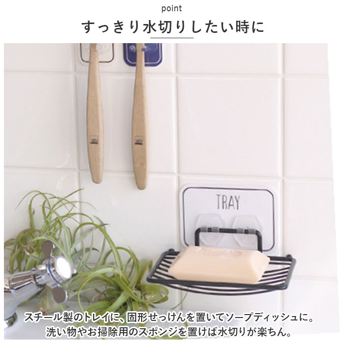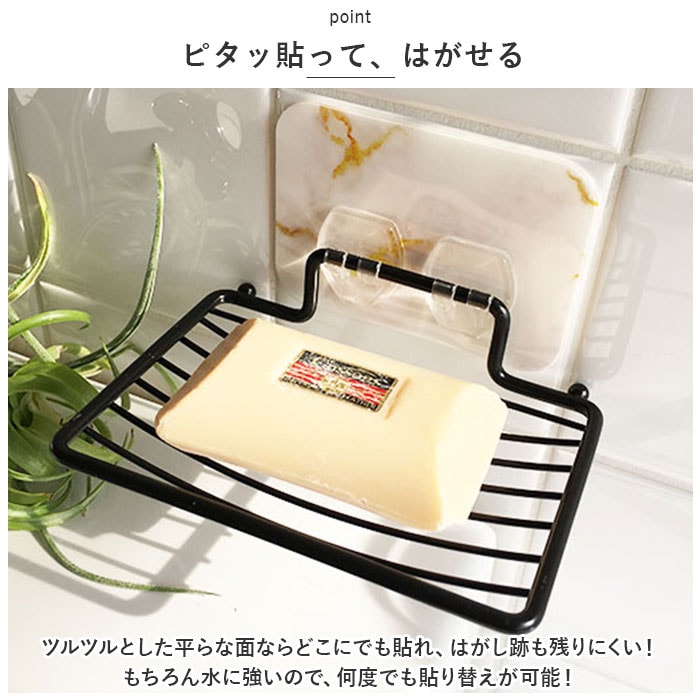 | 商品説明 | 壁にピタッと貼り付けるだけで、オシャレな“浮かせ収納”を実現!「Otel -オテル- マジックシート 水切りトレイ」が新登場♪【About Otel】・「Otel -オテル-」シリーズは、パリのアパルトマンをイメージしてデザインされた、シンプルでオシャレなシートフック収納。【ピタッ貼って、はがせる】ツルツルとした平らな面ならどこにでも貼れ、はがし跡も残りにくい!もちろん水に強いので、何度でも貼り替えが可能!【すっきり水切りしたい時に】スチール製のトレイに、固形せっけんを置いてソープディッシュに。洗い物やお掃除用のスポンジを置けば水切りが楽ちん。【手軽に貼って収納上手に】キッチンや浴室のタイル、キッチンのシンクや洗面台の鏡など、表面がツルツルとした場所であれば、マグネットの付かない場所にも設置可能。【取り付け方はとっても簡単】1.貼り付ける面をきれいにする。2.裏側の粘着保護紙を剥がし、シートを壁面に貼り付ける。3.中心から八方に空気を抜くように指でならす。4 30分程度放置して定着させ、トレイの金具を装着したら完成!【スペースを有効活用】バスルームやサニタリースペース、キッチンなどの水回りに手軽に収納が増やせちゃう!収納スペースの少ないワンルームでも大活躍! |