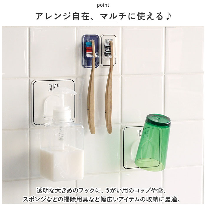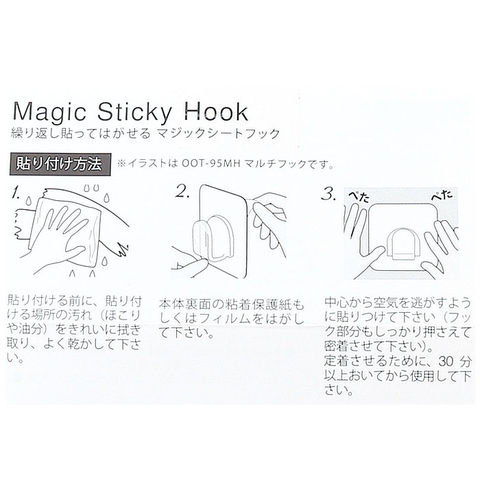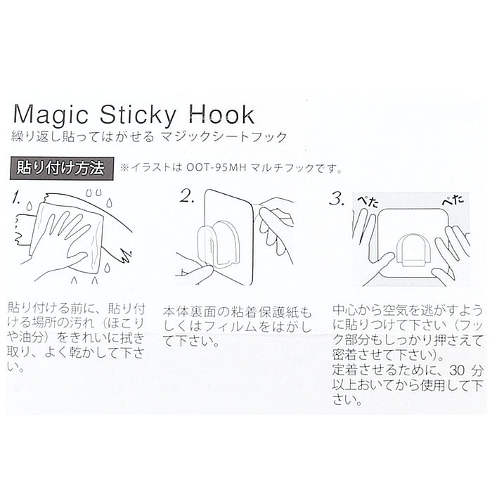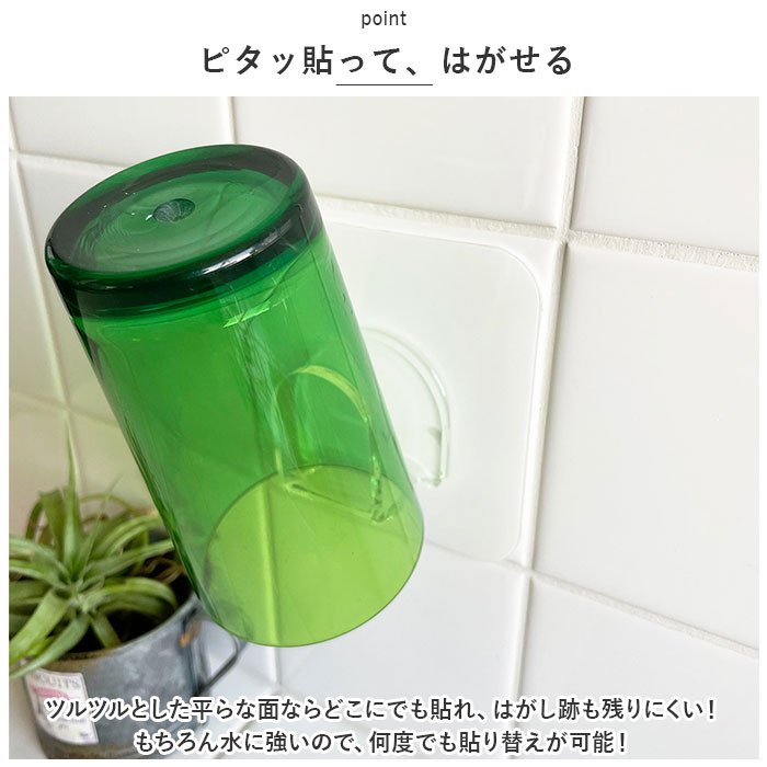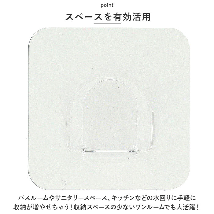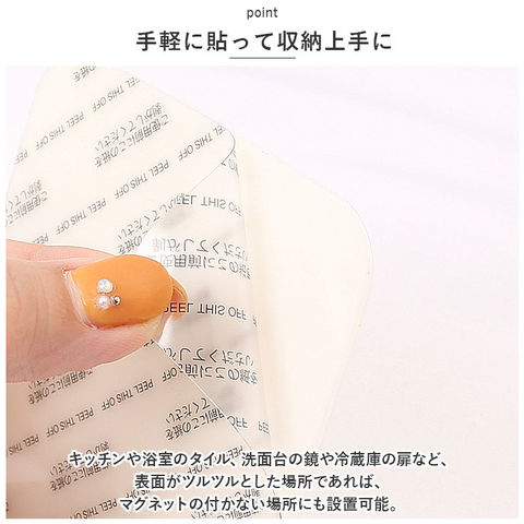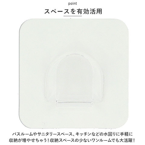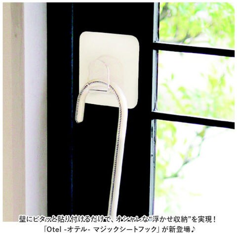 | 商品説明 | 壁にピタッと貼り付けるだけで、オシャレな“浮かせ収納”を実現!「Otel -オテル- マジックシートフック」が新登場♪【About Otel】・「Otel -オテル-」シリーズは、パリのアパルトマンをイメージしてデザインされた、シンプルなシートフック。【ピタッ貼って、はがせる】ツルツルとした平らな面ならどこにでも貼れ、はがし跡も残りにくい!もちろん水に強いので、何度でも貼り替えが可能!【アレンジ自在、マルチに使える♪】透明な大きめのフックに、うがい用のコップや傘、スポンジなどの掃除用具など幅広いアイテムの収納に最適。【手軽に貼って収納上手に】キッチンや浴室のタイル、洗面台の鏡や冷蔵庫の扉など、表面がツルツルとした場所であれば、マグネットの付かない場所にも設置可能。【取り付け方はとっても簡単】1.貼り付ける面をきれいにする。2.裏側の粘着保護紙を剥がし、シートを壁面に貼り付ける。3.中心から八方に空気を抜くように指でならす。4 30分程度置き、定着させたら完成!【スペースを有効活用】バスルームやサニタリースペース、キッチンなどの水回りに手軽に収納が増やせちゃう!収納スペースの少ないワンルームでも大活躍! |