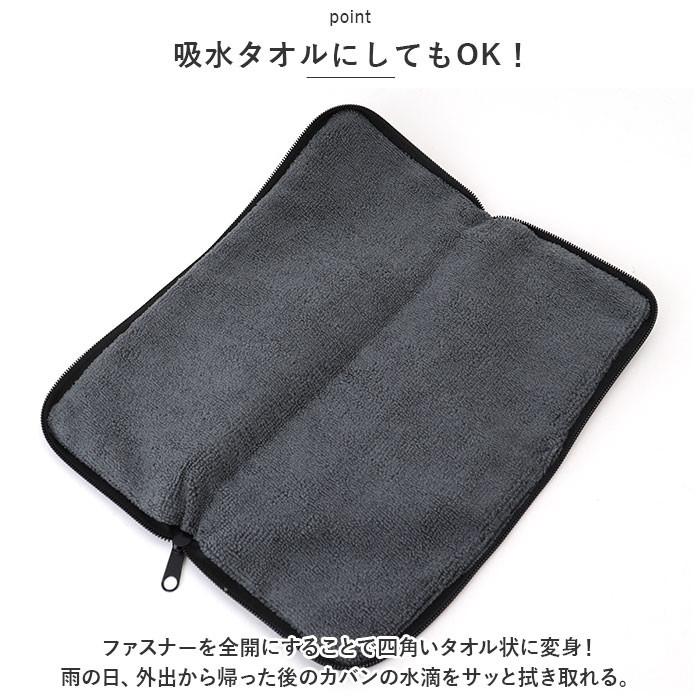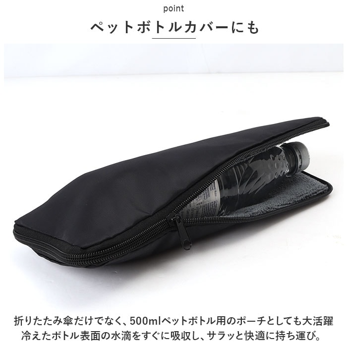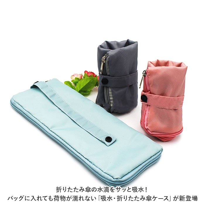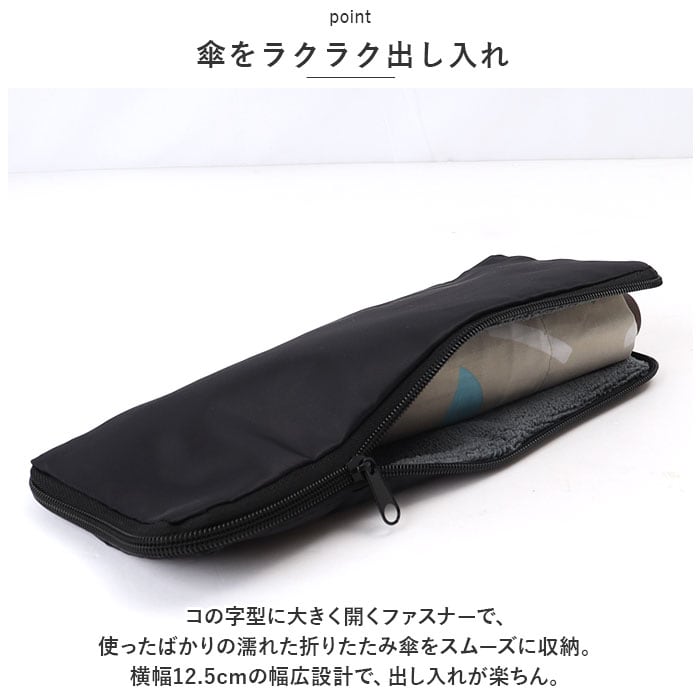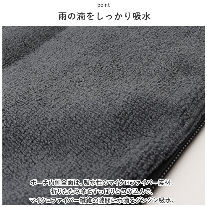 | 商品説明 | 折りたたみ傘の水滴をサッと吸水!バッグに入れても荷物が濡れない「吸水・折りたたみ傘ケース」が新登場。【傘をラクラク出し入れ】コの字型に大きく開くファスナーで、使ったばかりの濡れた折りたたみ傘をスムーズに収納。横幅12.5cmの幅広設計で、出し入れが楽ちん。【雨の滴をしっかり吸水】ポーチ内側全面は、吸水性のマイクロファイバー素材。折りたたみ傘をすっぽりと包み込んで、マイクロファイバー繊維の隙間に水滴をグングン吸水。【吸水タオルにしてもOK!】ファスナーを全開にすることで四角いタオル状に変身!雨の日、外出から帰った後のカバンの水滴をサッと拭き取れる。【収納時はコンパクトに】使わない時にはくるくると丸めて、ストラップのスナップボタンをパチンッと留めればとってもコンパクトに!【カバンの中を濡らさない!】傘を収納した状態でストラップをカバンのハンドルに取り付けると、カバンの中の荷物を濡らさずに、手荷物も増えないのが嬉しいポイント。【ペットボトルカバーにも】折りたたみ傘だけでなく、500mlペットボトル用のポーチとしても大活躍。冷えたボトル表面の水滴をすぐに吸収し、サラッと快適に持ち運び。【大きめ折りたたみ傘もすっぽり】お手持ちの折りたたみ傘の大きさに合わせて、ぴったりサイズが選べる「28cm×12.5cmタイプ」・「34cm×12.5cmタイプ」・「36cm×12.5cmタイプ」・「38cm×12.5cmタイプ」の4サイズ展開。 |