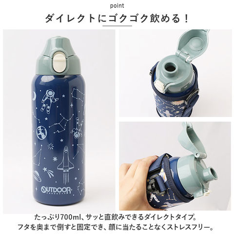| 商品説明 | いつでもどこでも水分補給♪アウトドアプロダクツの子ども用ステンレスボトル(700ml)が新登場。【ワンプッシュオープン】フタは片手で簡単オープン!誤作動による開閉を防ぐロック機能付きで安心◎【ダイレクトにゴクゴク飲める!】たっぷり700ml、サッと直飲みできるダイレクトタイプ。フタを奥まで倒すと固定でき、顔に当たることなくストレスフリー。【広口設計】ボトルの口部分は飲み物を注ぎやすく、氷も入れやすいつくり。毎日のドリンク準備がスムーズ◎【冷たさをキープ】本体内側と外側が真空断熱されたステンレス2重構造。屋外でも冷たさが持続し、夏の強い味方☆【ボトルを保護するポーチ】衝撃や傷付きから守る、面ファスナー&ジップのWホールドポーチが付属。記名スペース付きで、友達とお揃いでも大丈夫!【持ち運びラクラク】ポーチに付属のショルダーベルトを取り付ければ、首掛けや斜め掛けOK!通園・通学でも大活躍。 |